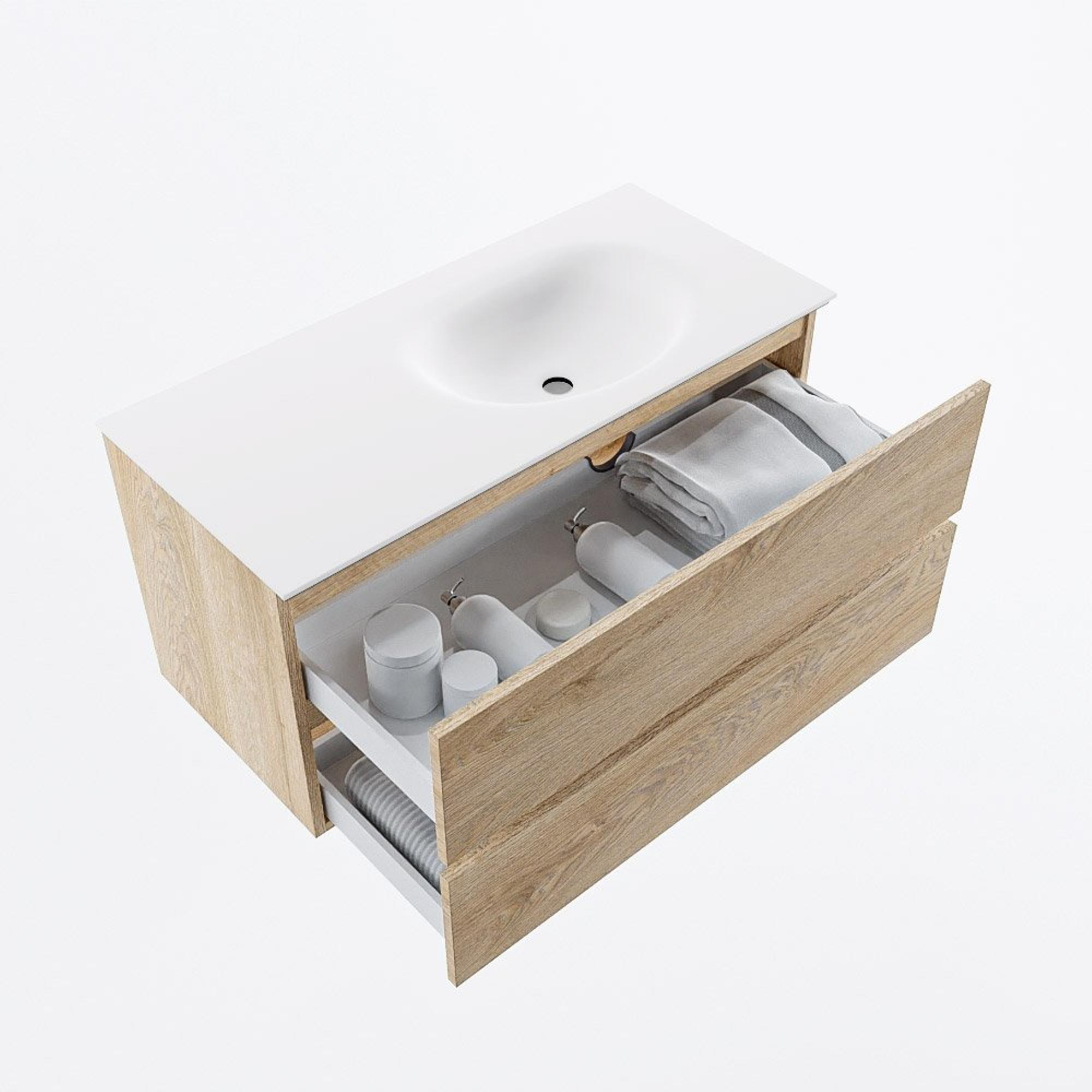 Si vous recherchez un meuble de salle de bains moderne qui dégage de la chaleur et soit pratique à l’usage quotidien, cette combinaison est alors un choix judicieux. Grâce à la largeur de 100 cm, vous disposez de beaucoup de place au niveau du lavabo, tandis que la profondeur compacte de 45 cm rend également le meuble adapté aux salles de bains de taille moyenne et un peu plus étroites. Les façades aspect bois créent une ambiance calme et naturelle, idéale si vous souhaitez transformer votre salle de bains en un espace paisible semblable à un spa. Grâce au montage mural suspendu, l’ensemble paraît encore plus spacieux et vous gardez le sol dégagé, ce qui n’est pas seulement esthétique mais aussi pratique pour le nettoyage. Le lavabo intégré avec la cuve sur le côté droit rend ce meuble particulièrement adapté aux configurations où vous avez par exemple à gauche un mur, une paroi de douche ou un espace de rangement supplémentaire. Comme aucun trou de robinetterie n’est pré-percé, vous pouvez choisir vous-même le mitigeur de lavabo à poser parfait qui correspond à votre style. Grâce aux deux tiroirs, vous pouvez en outre ranger discrètement tous vos produits de soin quotidiens, afin que votre plan de lavabo reste épuré et bien ordonné.