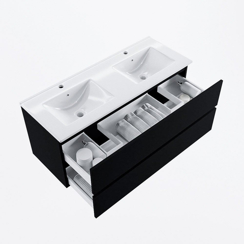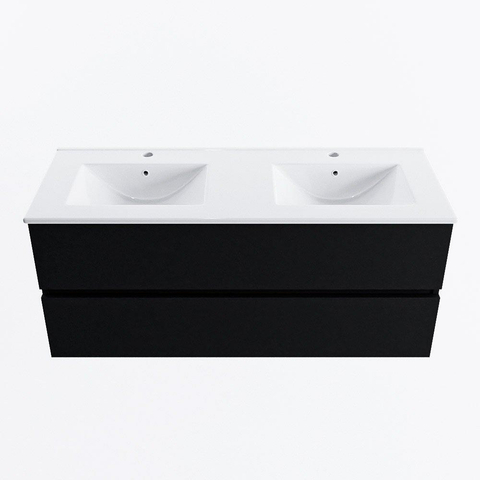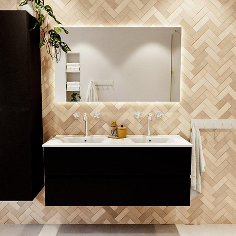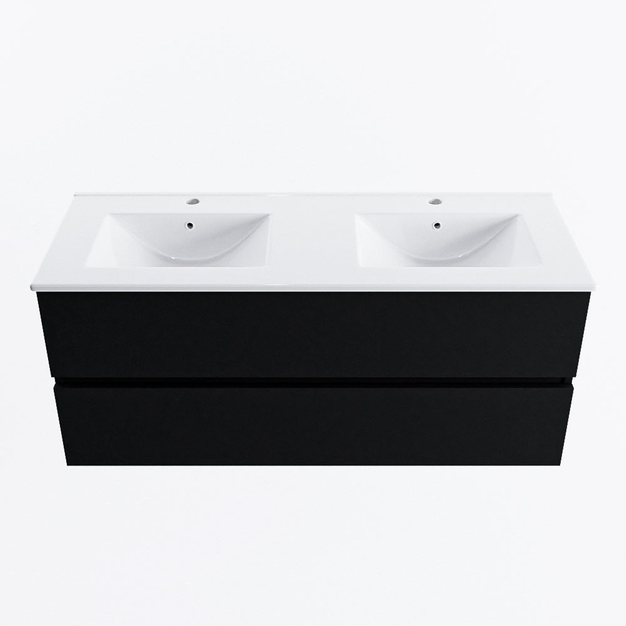 MONDIAZ VICA meuble sous lavabo 120cm Urban 2 tiroirs. Lavabo DENIA double 2 trous de robinet, couleur Blanc Brillant.