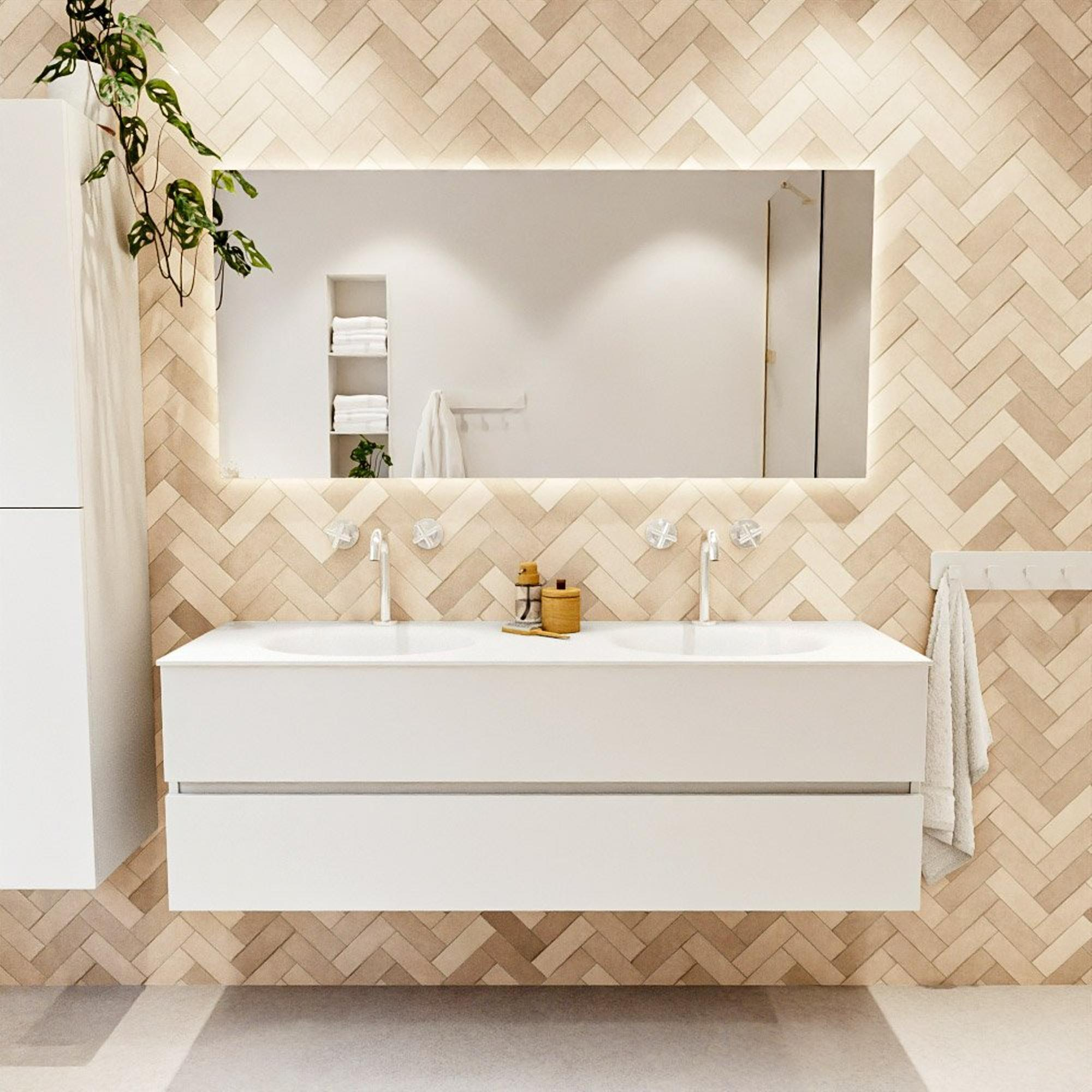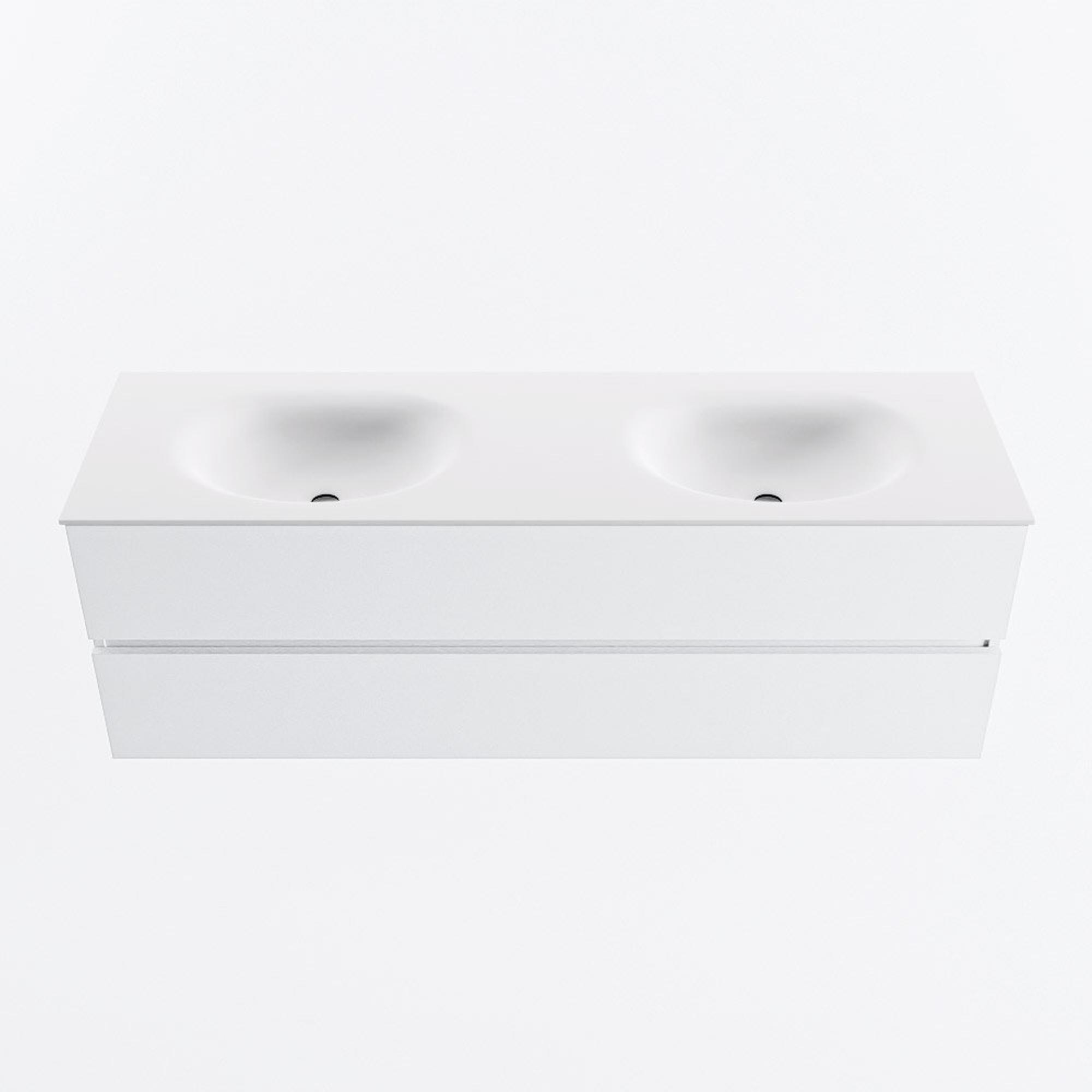 MONDIAZ VICA meuble sous lavabo 150cm Talc 2 tiroirs. Lavabo MOON double 2 trous de robinet, couleur Talc.