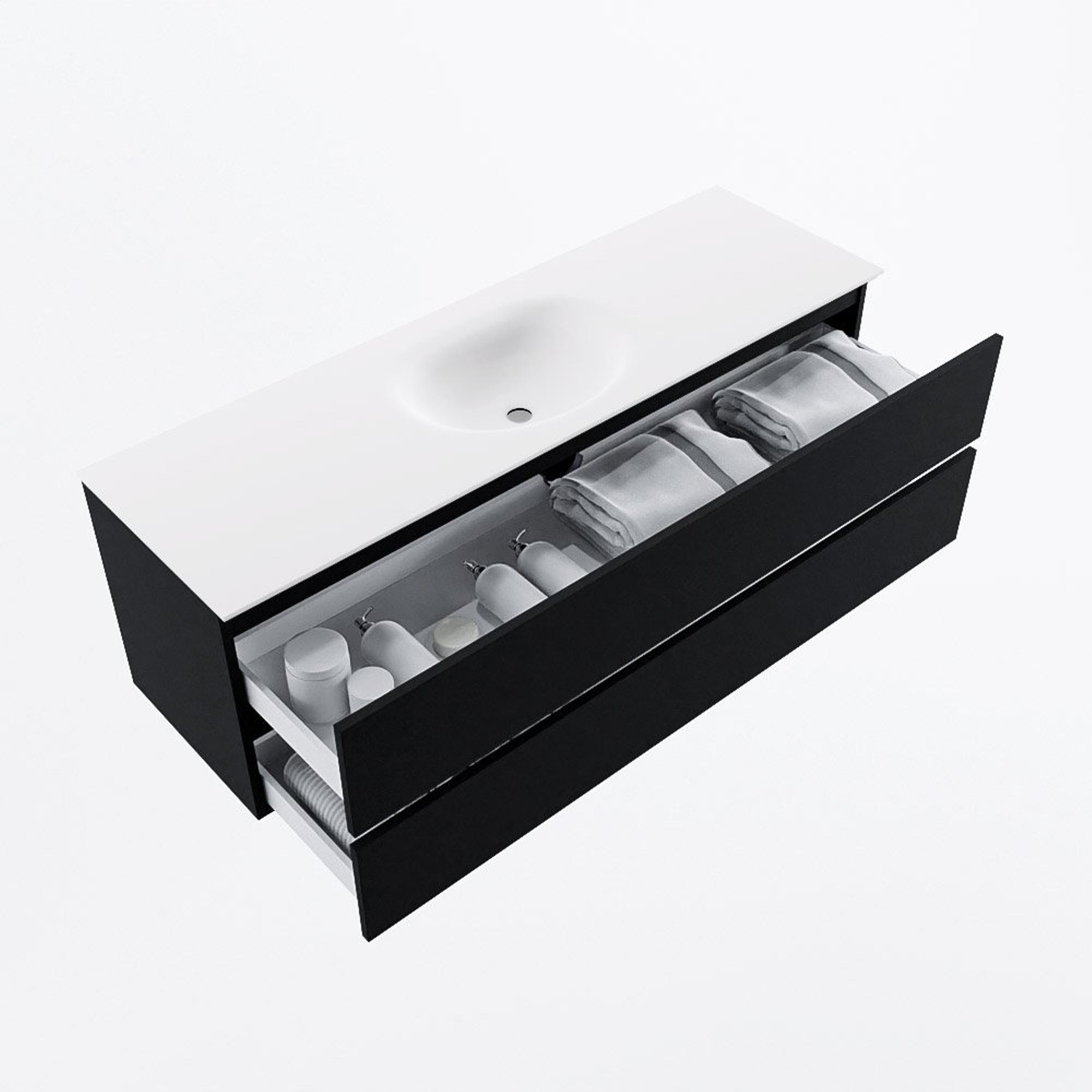 Avec une largeur de 150 cm et deux grands tiroirs, vous disposez de plus qu’assez d’espace pour les serviettes, les produits de soin et les accessoires quotidiens de la salle de bains. Les façades sans poignées offrent un aspect épuré et apaisant, sans interruptions ni poignées saillantes. Vous gardez ainsi le plan de toilette dégagé de petits objets et tout reste rangé de manière claire, ce qui contribue directement à une sensation d’ordre dans toute la salle de bains. Comme le meuble est monté au mur, vous pouvez également nettoyer facilement sous le meuble et l’espace paraît plus grand et plus lumineux.