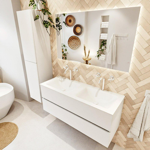 Avec une largeur de 120 cm et un lavabo double, vous disposez de tout l’espace nécessaire pour vous tenir confortablement à deux devant le lavabo. Le lavabo CLOUD avec deux trous de robinet vous permet d’installer deux robinets, idéal lorsque vos routines du matin et du soir ont souvent lieu en même temps. Comme l’ensemble est monté au mur, la salle de bains paraît plus spacieuse et l’ensemble a un aspect épuré et ordonné. La couleur Talc est une teinte blanche douce et chaleureuse qui dégage du calme et se combine facilement avec différents styles, du minimaliste au style hôtel chic. Vous créez ainsi un espace de toilette pratique dont l’esthétique est également parfaitement aboutie.