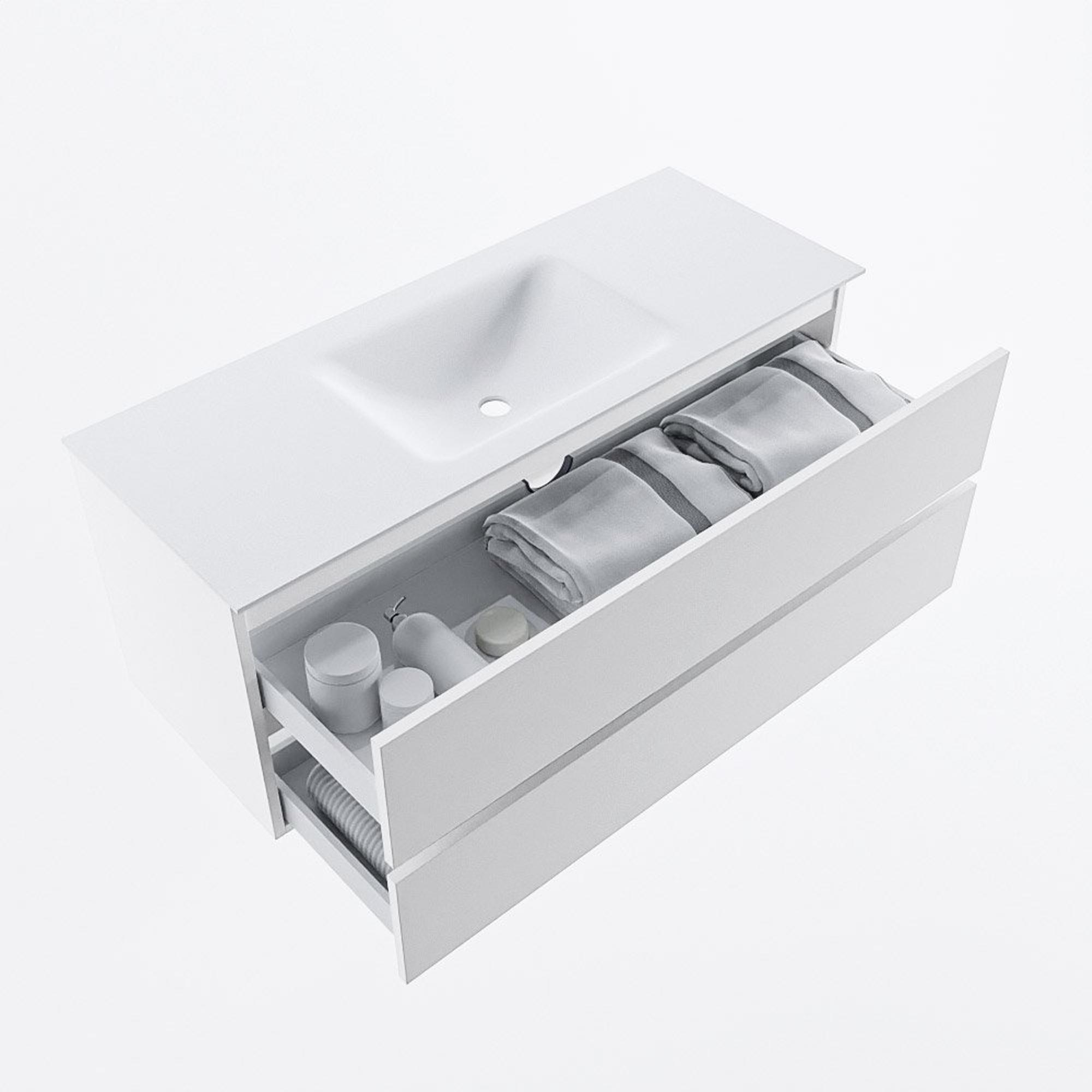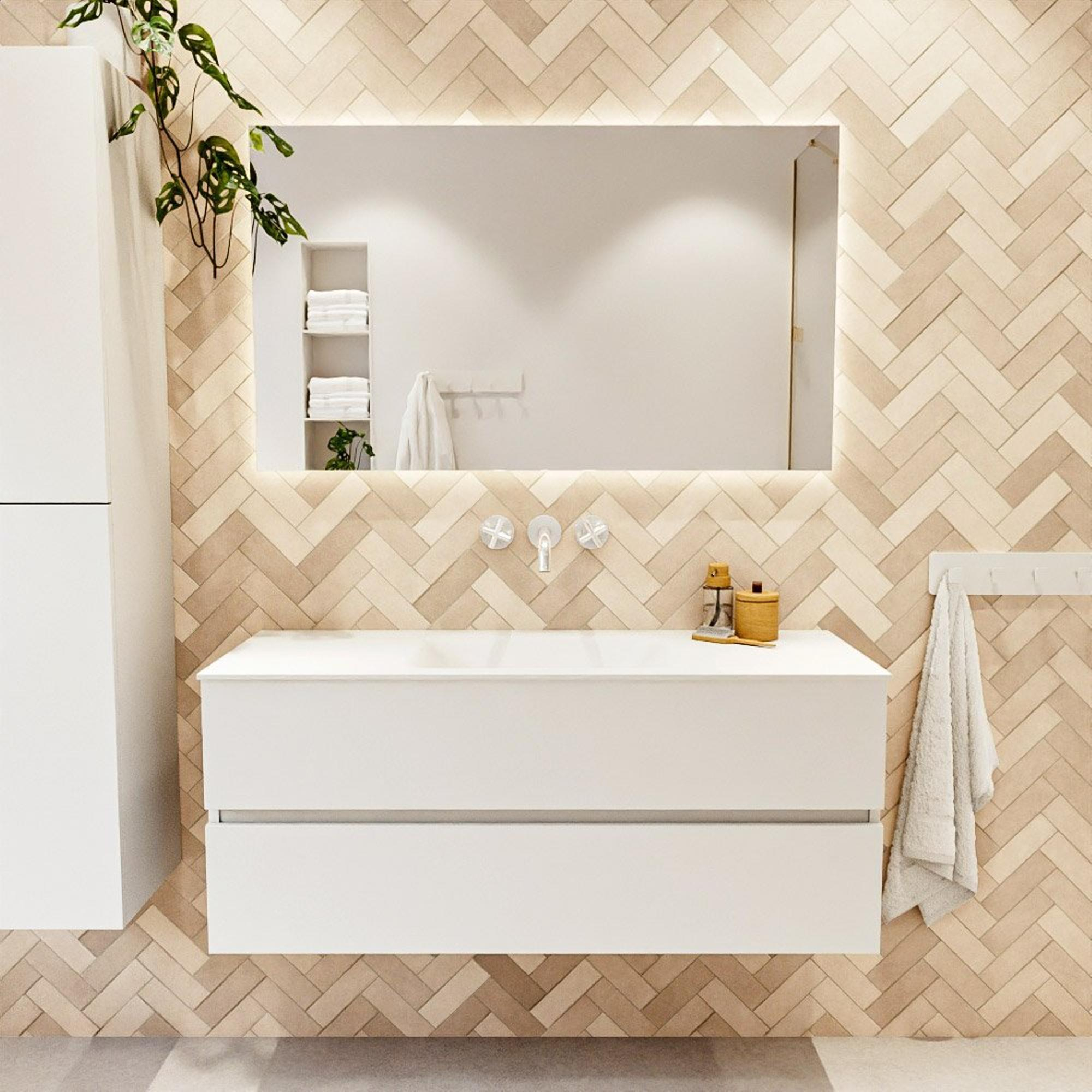 Le sous-meuble mesure 120 cm de large et est équipé de deux grands tiroirs, afin que vous puissiez ranger de manière ordonnée toutes vos affaires quotidiennes de salle de bains. Pensez aux serviettes, produits de soin, outils de coiffage et flacons de réserve : tout trouve sa place, ce qui permet à votre plan de lavabo de rester calme et bien rangé. La finition sans poignées assure un look moderne et évite de vous accrocher à des poignées saillantes. Grâce à l’agencement bien pensé, vous avez accès à vos affaires en un seul geste et vous gardez la salle de bains plus facilement en ordre. Ce n’est pas seulement agréable à l’usage au quotidien, mais cela rend également l’heure de pointe du matin avec plusieurs membres de la famille beaucoup plus détendue.