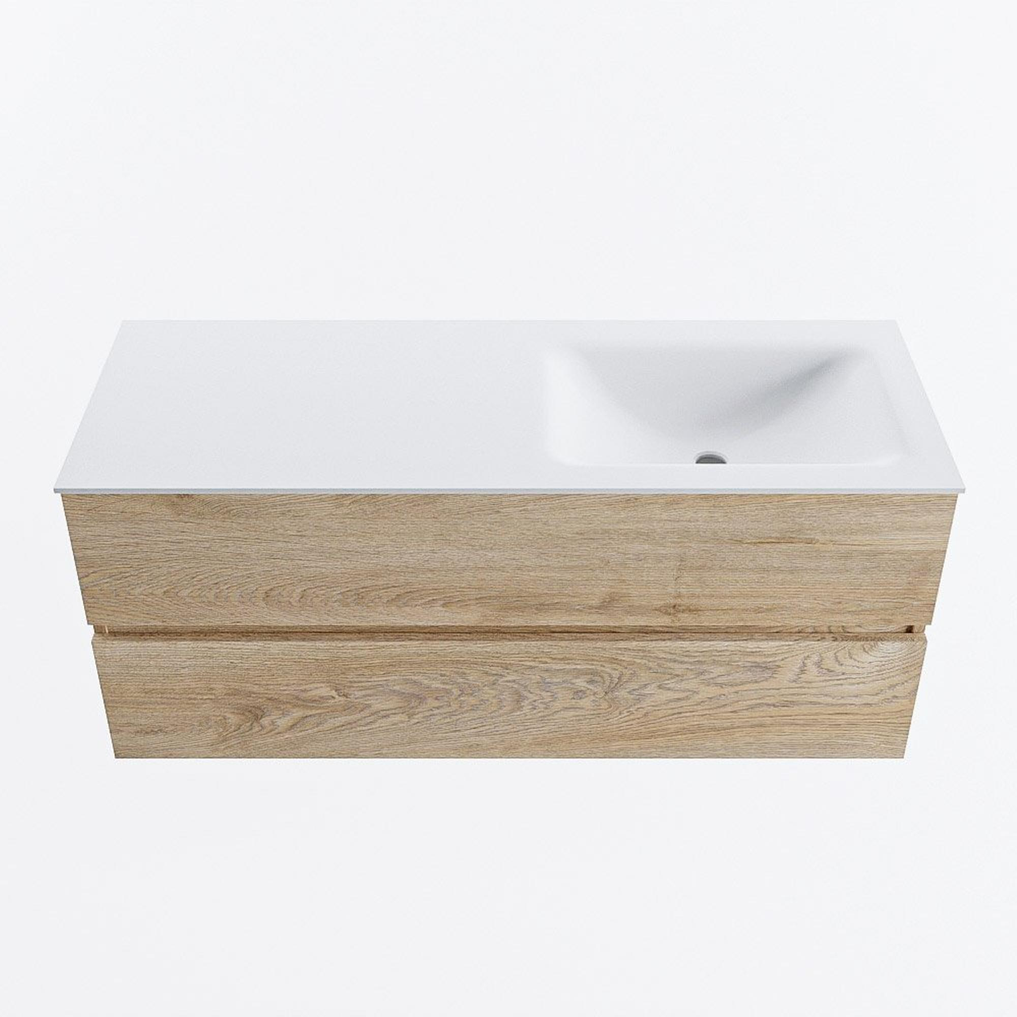 MONDIAZ VICA meuble sous lavabo 120cm Chêne blanchi 2 tiroirs. Lavabo CLOUD à droite sans trou de robinet, couleur Talc.