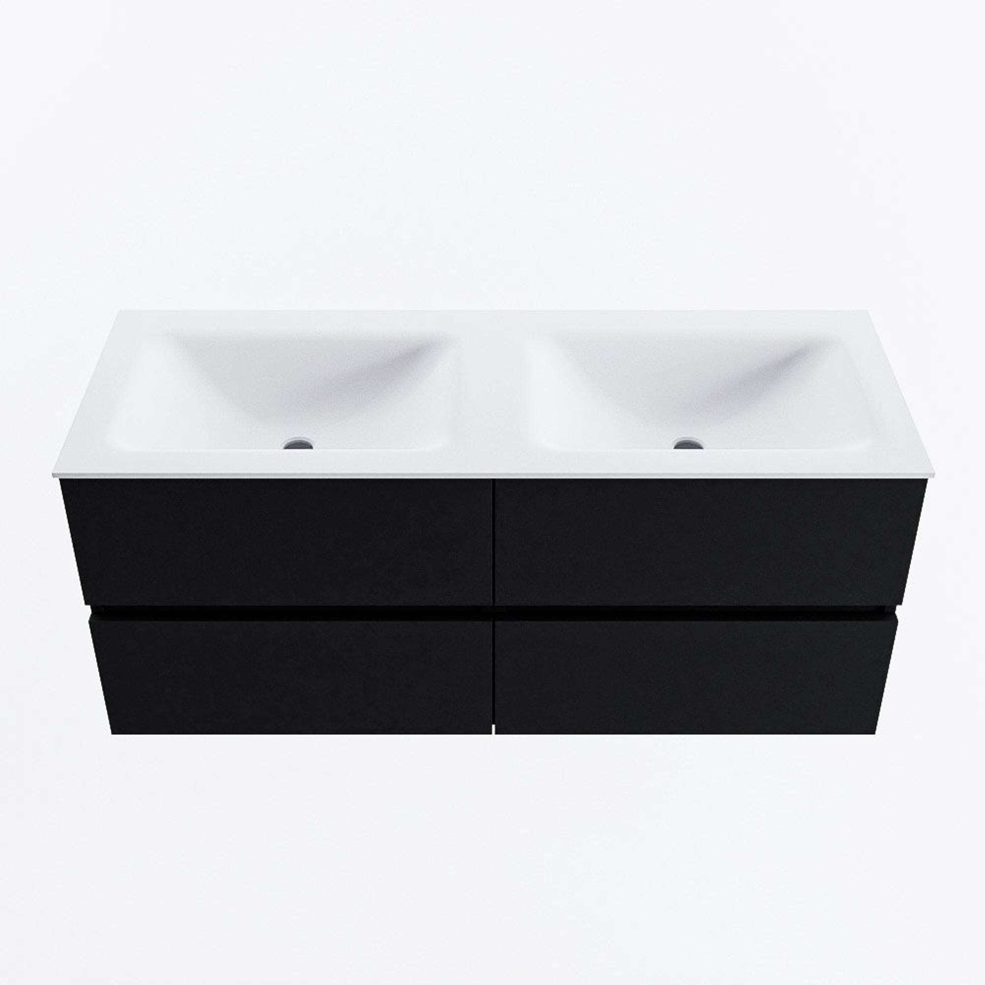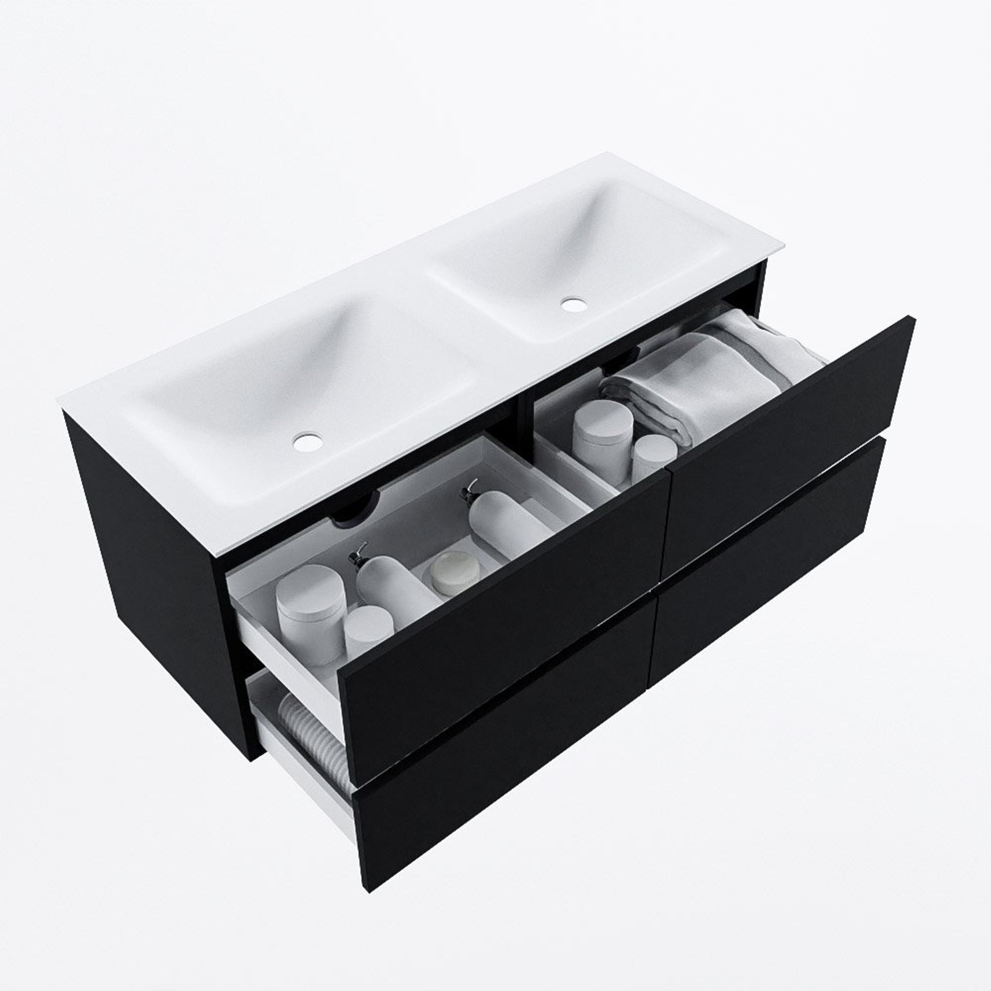 La combinaison d’un meuble sous-vasque en MDF robuste et d’un lavabo en solid surface fait de ce meuble un choix durable et fiable pour une utilisation quotidienne intensive. Le MDF est stable et adapté aux salles de bains, tandis que le solid surface est réputé pour son aspect lisse, sans joints et sa sensation haut de gamme. La surface du lavabo est lisse et non poreuse, ce qui la rend facile à nettoyer et résistante aux taches courantes dans la salle de bains. Le double lavabo avec deux cuves offre suffisamment d’espace par personne, de sorte que l’eau ne gicle pas partout et que votre plan de travail reste bien net. Vous profitez ainsi pendant des années d’un meuble de salle de bains qui n’est pas seulement beau, mais aussi pratique et robuste.