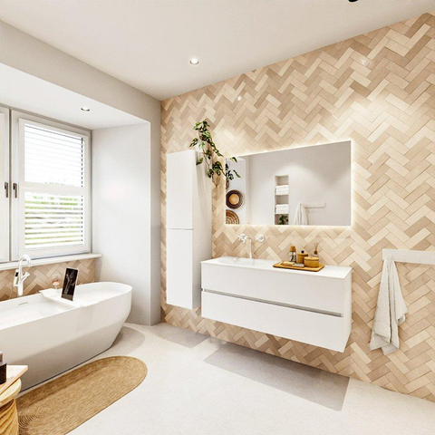 Vous recherchez un meuble de salle de bains épuré et moderne qui dégage de la sérénité et offre beaucoup d’espace de rangement, sans donner l’impression que votre salle de bains est surchargée ? Alors cette combinaison de sous-meuble avec lavabo intégré est un choix judicieux. La largeur généreuse de 120 cm rend le meuble idéal pour les salles de bains de taille moyenne à spacieuse, tandis que la profondeur compacte est pratique dans les zones de passage. La douce couleur Talc crée une ambiance sereine, façon spa, qui se marie parfaitement avec des carreaux clairs ou foncés. Grâce au lavabo avec vasque à gauche et trou de robinet parfaitement positionné, vous créez un espace de lavage ergonomique et pratique, idéal pour une utilisation quotidienne par vous et votre famille.