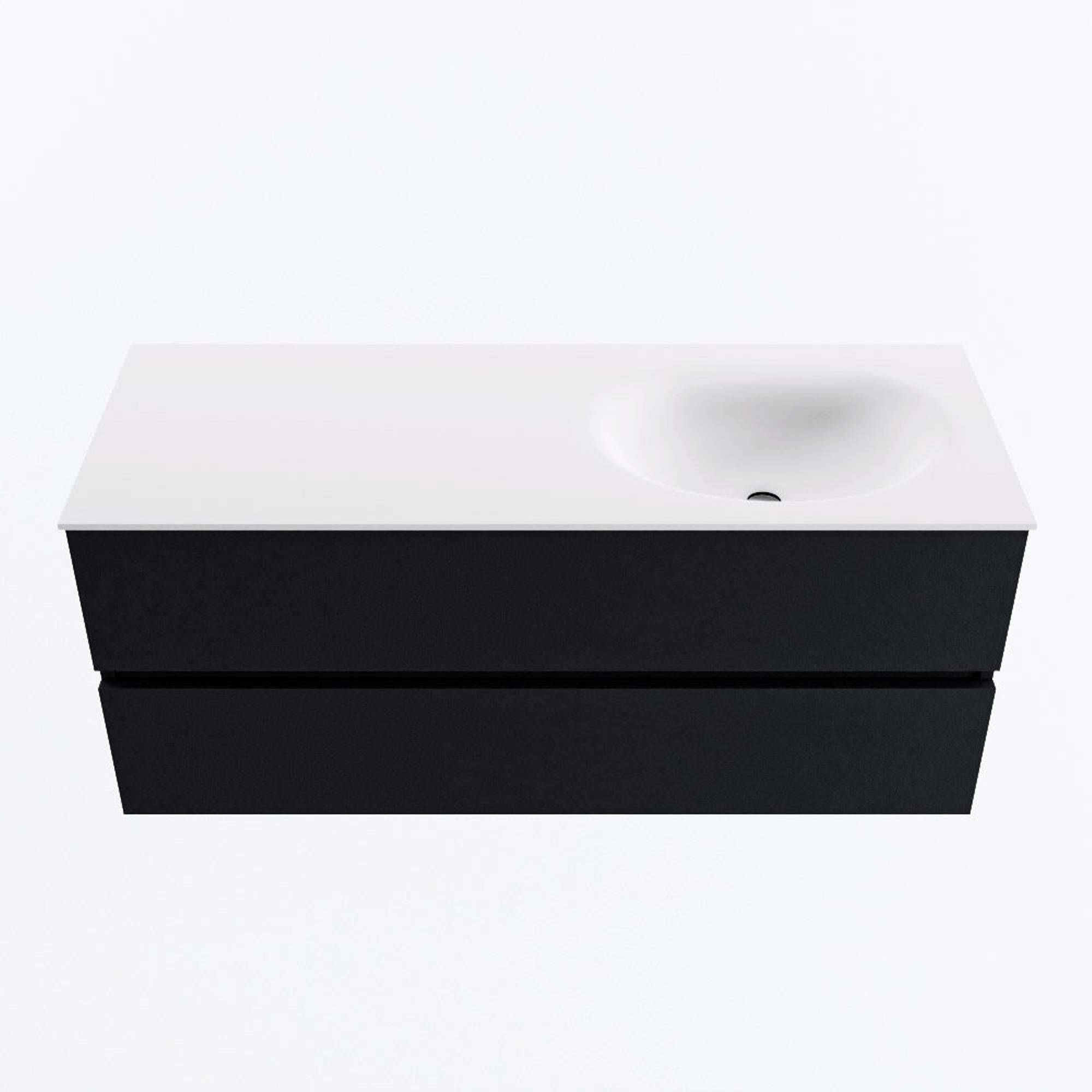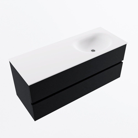 La largeur généreuse de 120 cm vous offre un plan de travail confortable et suffisamment d'espace autour du lavabo, de sorte que vos articles de toilette ne gênent pas directement. La cuve se trouve sur le côté droit, ce qui est pratique si, à gauche du meuble, vous avez par exemple une paroi de douche, une baignoire ou une porte. La façade sans poignées assure une apparence minimaliste et apaisante qui s'intègre parfaitement dans une salle de bains design moderne. Comme le meuble est fixé de façon suspendue au mur, la pièce paraît plus grande et le sol reste libre pour un nettoyage facile. Vous combinez ainsi un look épuré avec un agencement qui tient vraiment compte de l'utilisation quotidienne.