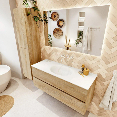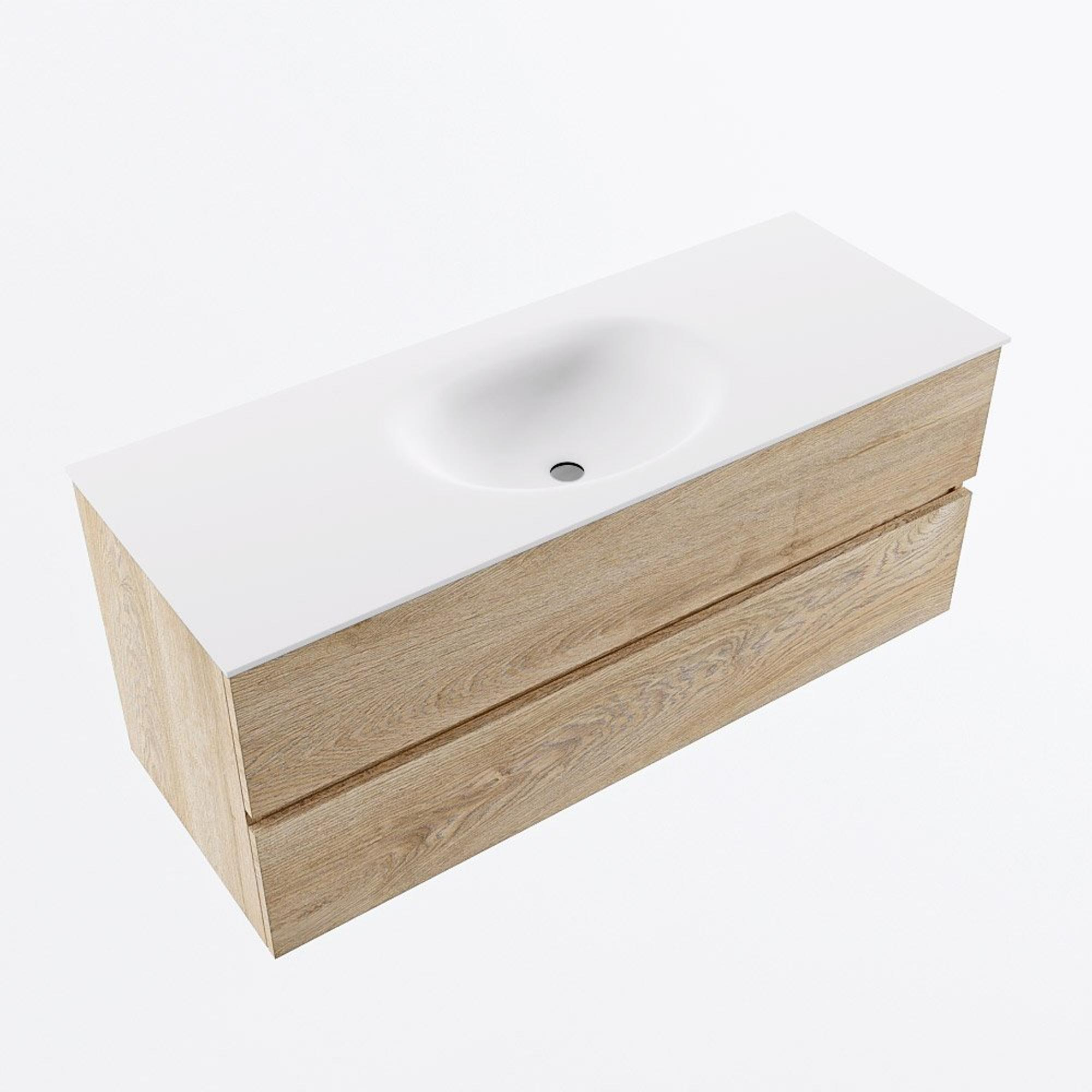 MONDIAZ VICA meuble sous lavabo 120cm Chêne blanchi 2 tiroirs. Lavabo MOON central sans trou de robinet, couleur Talc.