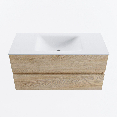 MONDIAZ VICA 100cm meuble sous lavabo Chêne blanchi 2 tiroirs. Lavabo CLOUD central sans trou de robinet, couleur Talc.