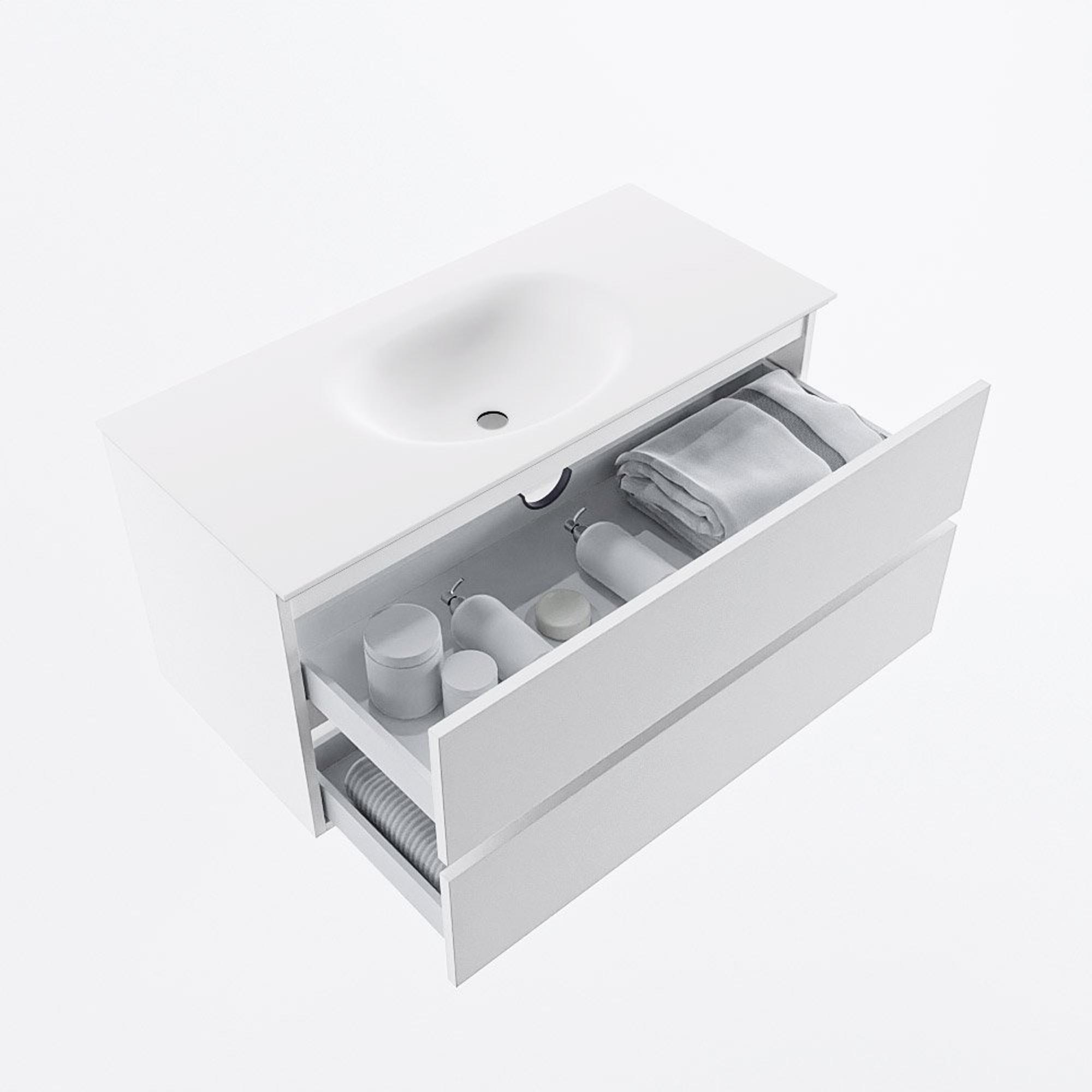 Avec deux larges tiroirs sur toute la largeur de 100 cm, vous disposez d’un espace de rangement étonnamment grand pour les serviettes, les produits de soin et les objets du quotidien. L’agencement vous aide à garder votre salle de bains organisée : ce que vous utilisez souvent se place à l’avant, le reste bien rangé derrière. Grâce aux façades sans poignées, vous ouvrez les tiroirs facilement et la face avant reste parfaitement épurée. Ainsi, votre salle de bains n’est pas seulement belle le premier jour, mais elle reste également claire et ordonnée au quotidien, même avec plusieurs utilisateurs dans la maison.
