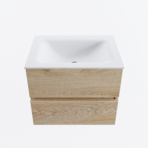 MONDIAZ VICA 60cm meuble sous lavabo Chêne blanchi 2 tiroirs. Lavabo CLOUD central sans trou de robinet, couleur Talc.