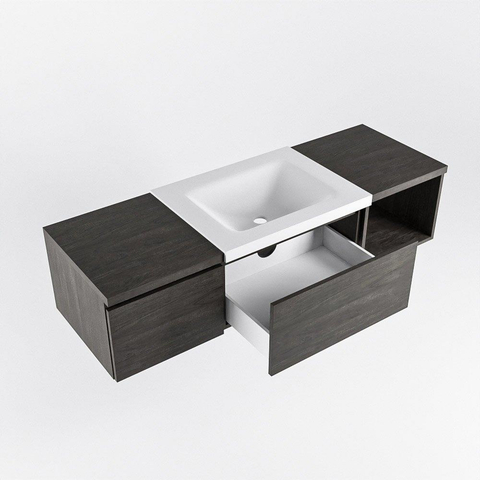 MONDIAZ BUKLA meuble de salle de bain 140 cm avec module ouvert 40 à droite couleur Marron Foncé avec 2 tiroirs. Lavabo CLOUD centre 1 trou de robinet couleur Talc.