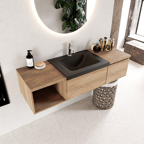 MONDIAZ BUKLA 140cm meuble de salle de bains avec module ouvert 40 à gauche couleur Washed Oak avec 2 tiroirs. Lavabo CLOUD central 1 trou de robinet couleur Urban.
