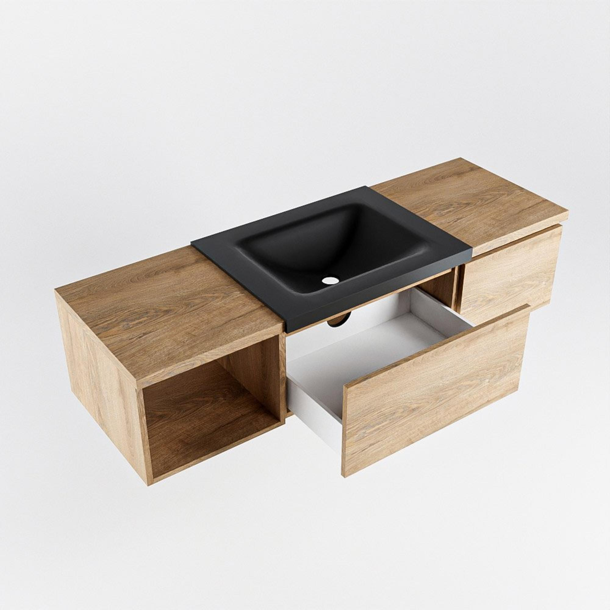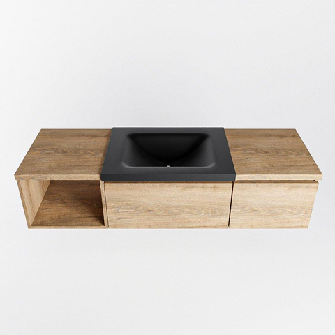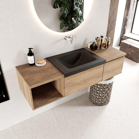 Avec ce meuble de salle de bains généreux, vous créez en une seule fois une zone de lavabo calme, ordonnée et élégante. La combinaison de la couleur chaude du bois avec la vasque sombre et épurée s’intègre parfaitement dans les salles de bains modernes et scandinaves, mais fonctionne aussi de façon étonnamment belle dans un style industriel ou hôtel chic. Grâce à la largeur généreuse de 140 cm et au module ouvert à gauche, il y a amplement d’espace pour l’utilisation quotidienne, tandis que les deux tiroirs veillent à ce que toutes vos affaires de toilette restent soigneusement hors de vue. Si vous recherchez une solution basse et suspendue qui libère le sol et donne l’illusion d’une salle de bains plus grande, ce meuble est un choix particulièrement judicieux.
