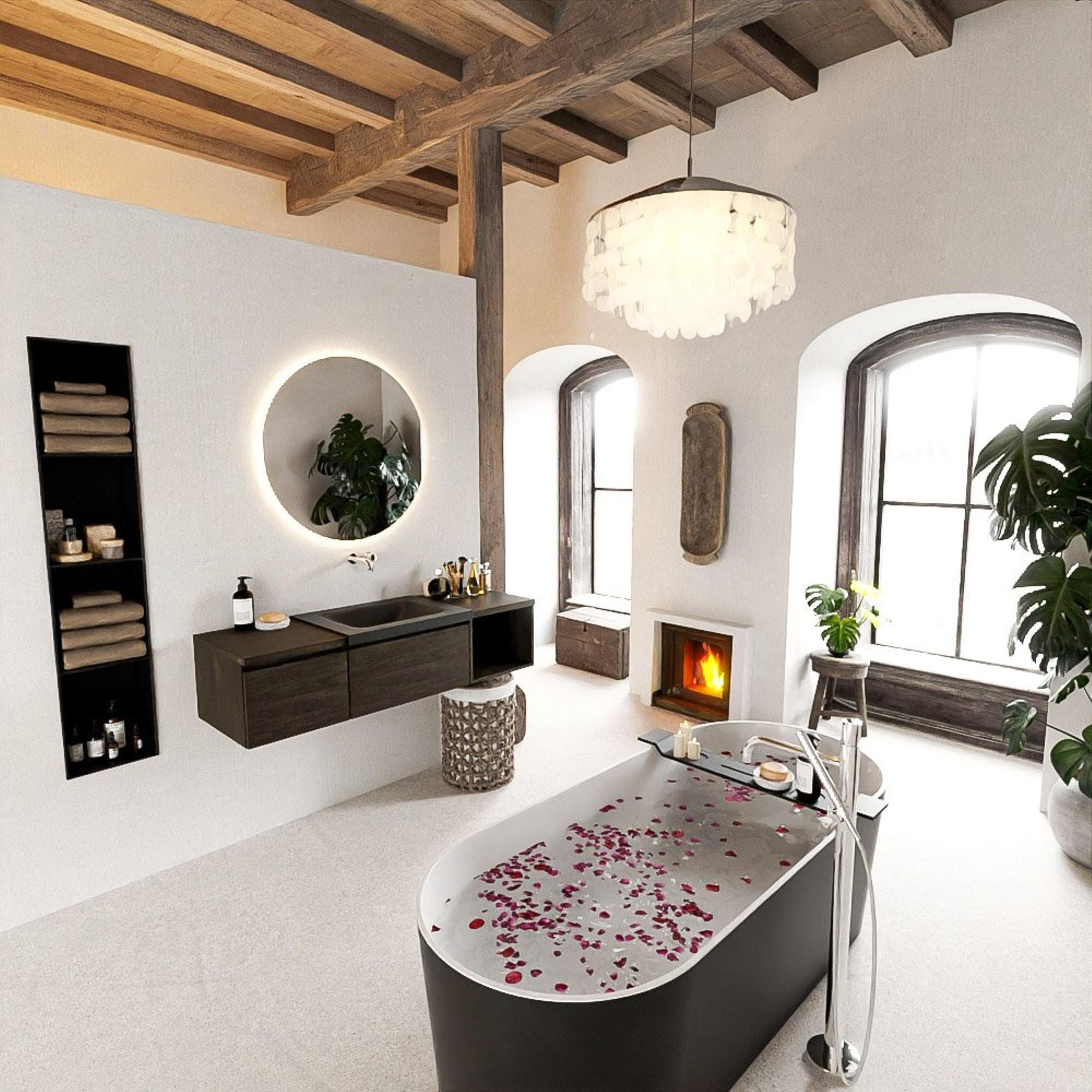 Avec ce meuble de salle de bains généreux, vous faites entrer chez vous un véritable accroche-regard qui s’intègre parfaitement dans une salle de bains moderne et axée sur le design. La combinaison d’un décor bois foncé, d’un lavabo aux lignes épurées et d’un module ouvert le rend idéal pour tous ceux qui souhaitent beaucoup d’espace de rangement tout en gardant la pièce légère et aérée. Grâce à la largeur de 140 cm, ce meuble trouve magnifiquement sa place dans les salles de bains de taille moyenne à spacieuse, par exemple dans une construction neuve ou une master bathroom rénovée. Le lavabo sans trou de robinet est un choix judicieux si vous aimez travailler avec un robinet posé sur le plan ou un mitigeur mural et souhaitez ainsi créer un style minimaliste et chic façon hôtel. Vous cherchez un meuble à la fois pratique et élégant, avec de la place pour tous vos articles de toilette et de l’espace pour exposer de beaux accessoires ? Cette solution répond alors parfaitement à vos attentes.