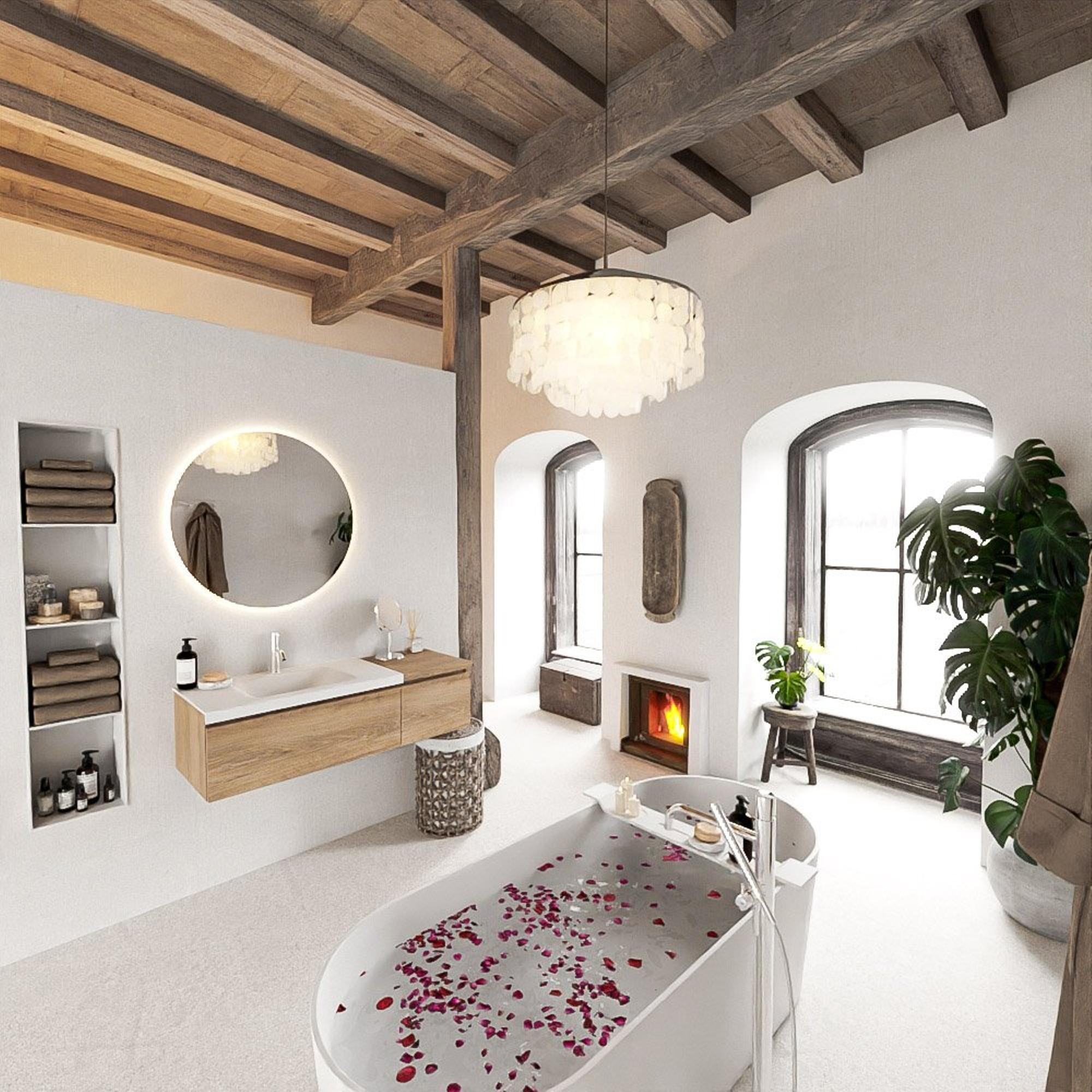 - Décor bois chaud Chêne lavé qui s’intègre parfaitement dans les salles de bains modernes et naturelles
