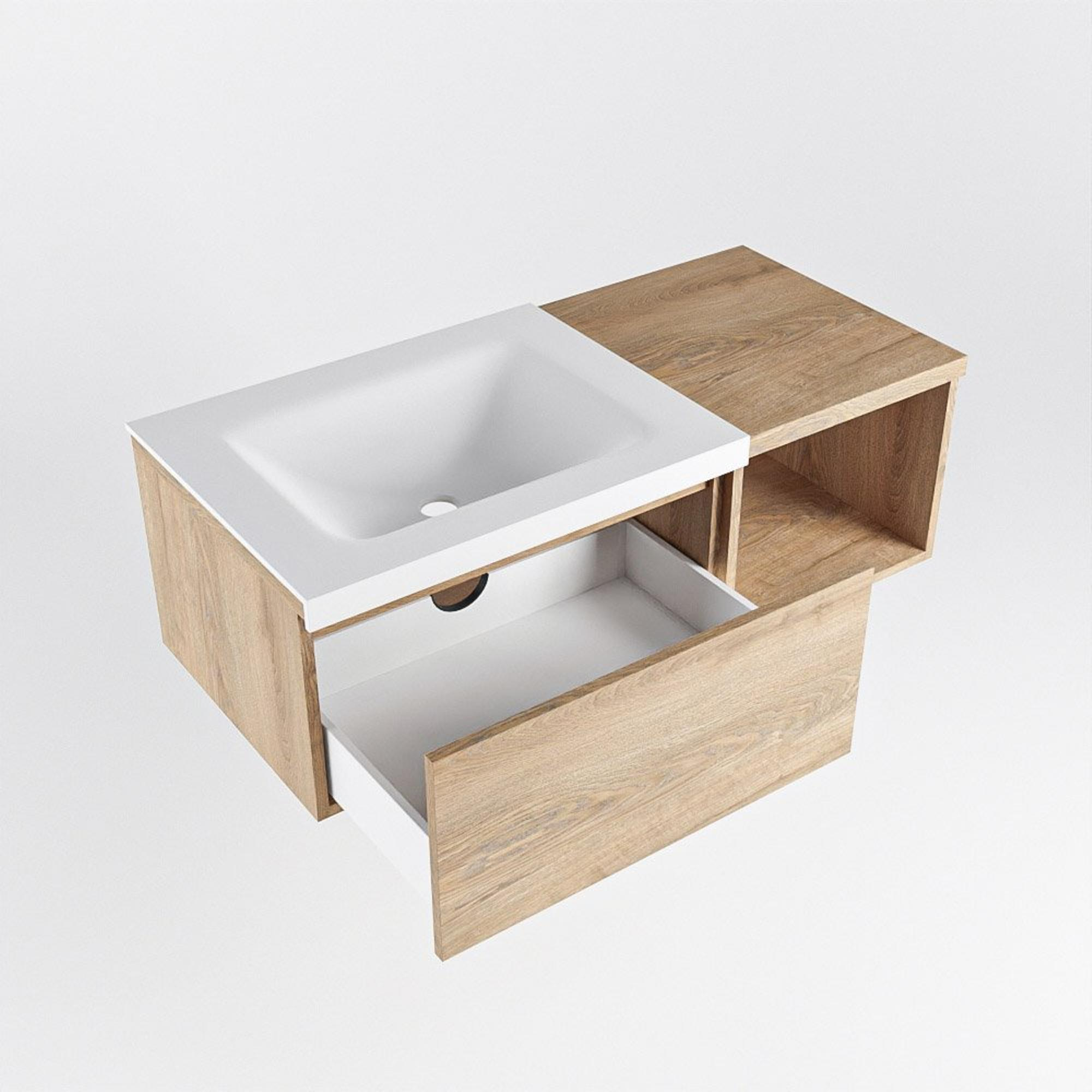 Ce meuble de salle de bain MONDIAZ BUKLA dégage style et élégance avec sa couleur Chêne Blanchi et son design épuré. Le module ouvert offre une apparence moderne et fournit suffisamment d'espace pour ranger vos accessoires de salle de bain. Le lavabo CLOUD à gauche dans la couleur Talc ajoute une touche de raffinement à l'ensemble.