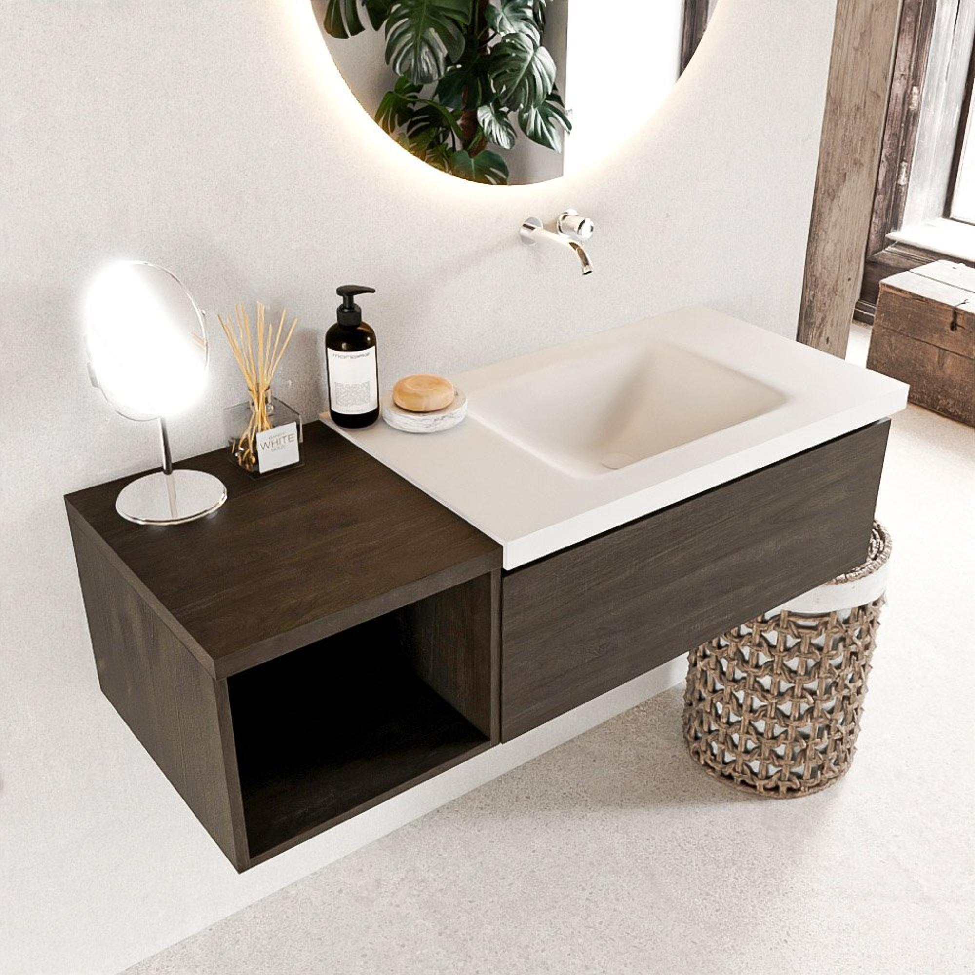 La teinte bois dark brown s'accorde parfaitement avec les styles de salle de bains populaires tels que moderne, hôtel chic et scandinave chaleureux. La façade sans poignée offre une apparence épurée et minimaliste, tandis que la structure du bois apporte une touche naturelle et accueillante. Le lavabo placé à droite dans la couleur Talc (blanc mat) crée un contraste raffiné avec le meuble sombre et met particulièrement bien en valeur la forme de la vasque. Comme aucun trou pour robinet n'est pré-percé, vous pouvez choisir vous-même un élégant mitigeur surélevé dans le style et la couleur en harmonie avec le reste de votre sanitaire. Vous créez ainsi un ensemble harmonieux et bien pensé qui donne l'impression d'une solution sur mesure.