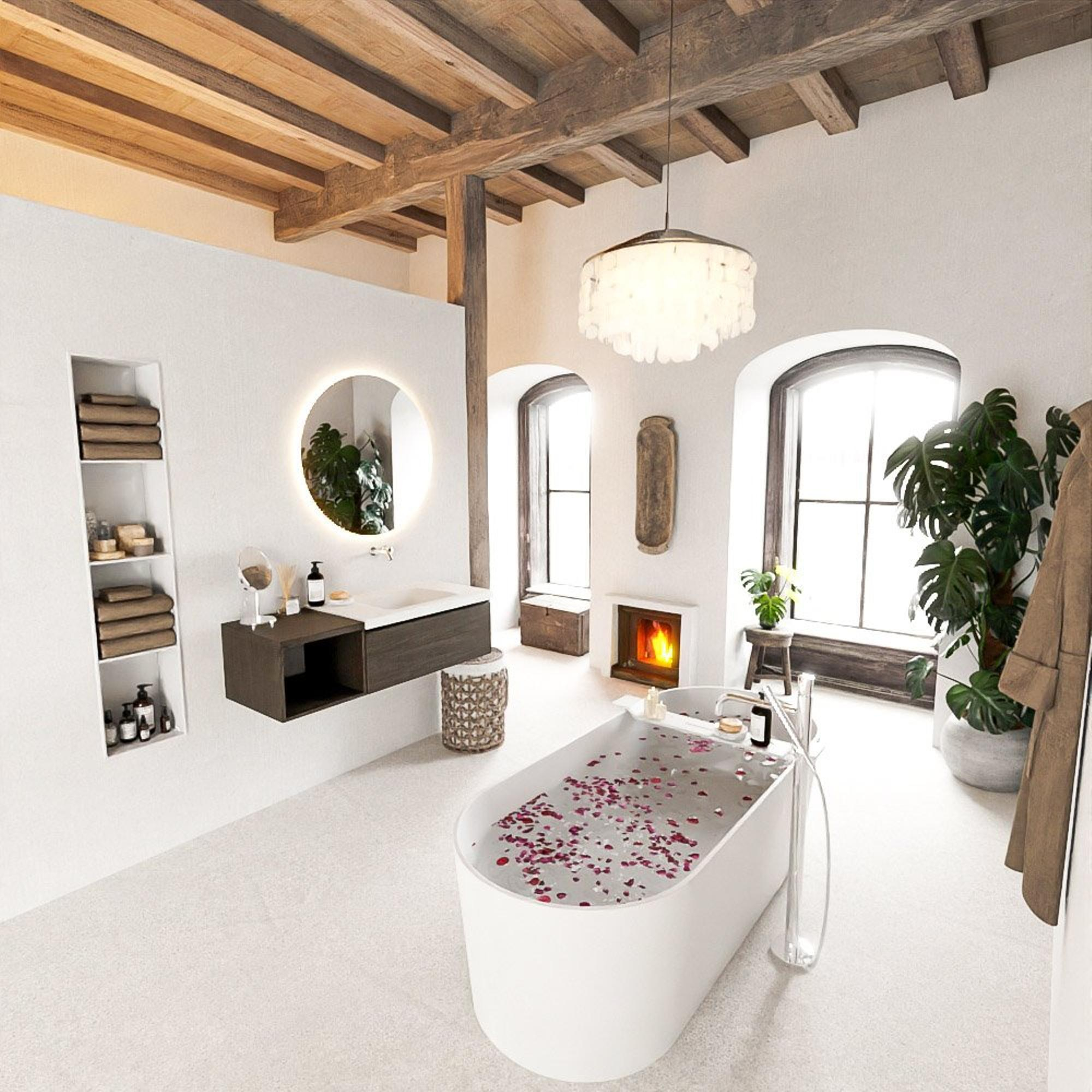 La combinaison d'un large tiroir et d'un module ouvert rend ce meuble particulièrement pratique au quotidien. Dans le tiroir, vous rangez tous vos produits de soin, maquillage et petits accessoires bien à l'abri des regards, afin que votre plan reste toujours visuellement apaisant. La niche ouverte est idéale pour les serviettes, les bougies parfumées ou un joli panier, ce qui vous permet d'ajouter facilement de l'ambiance sans sacrifier la fonctionnalité. Avec une largeur de 120 cm et une profondeur standard de 45,5 cm, vous disposez de suffisamment d'espace de travail autour du lavabo, tout en conservant un meuble visuellement fin contre le mur. La pose murale assure en outre un sol dégagé, ce qui rend l'aspiration et la serpillière beaucoup plus faciles.