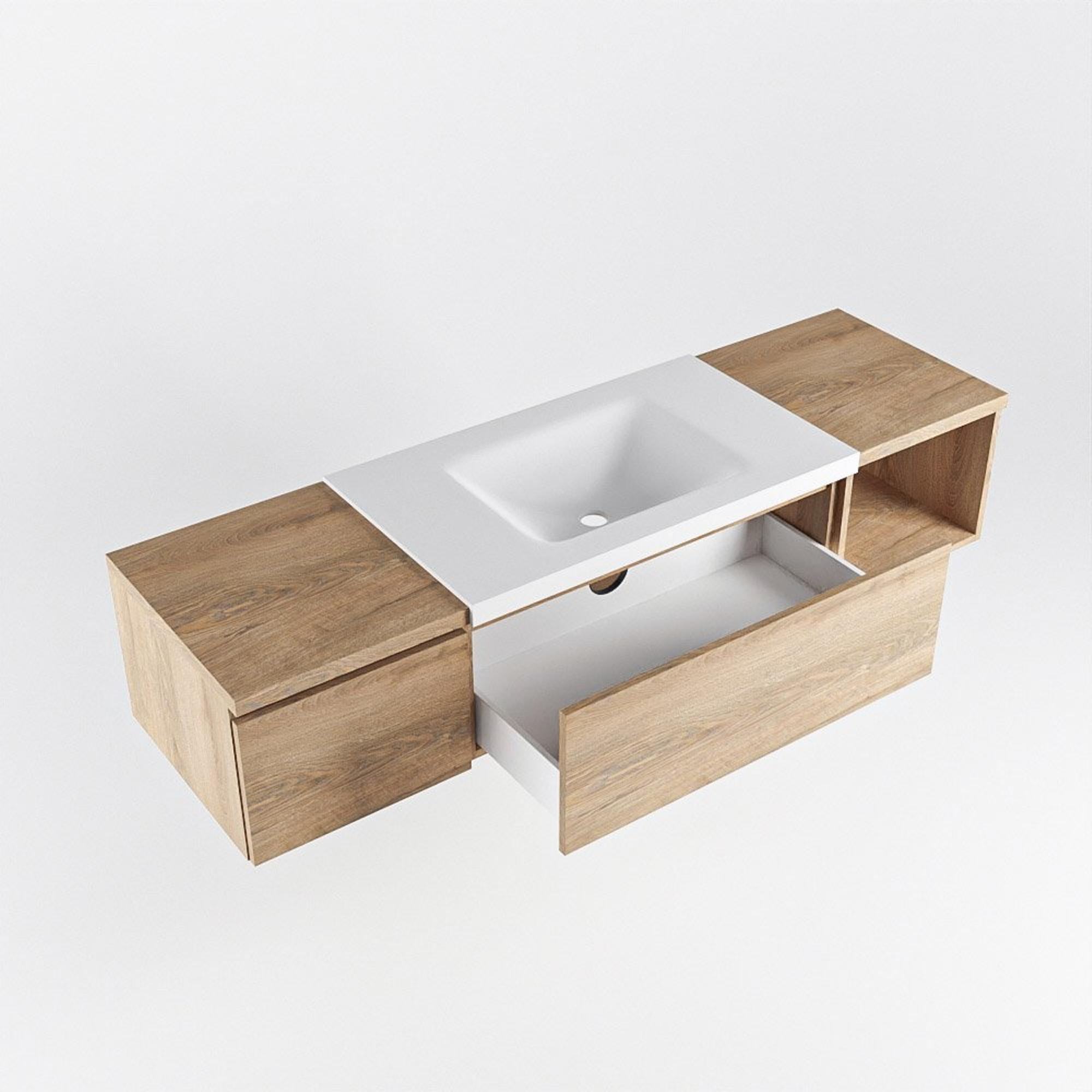 MONDIAZ BUKLA meuble de salle de bain 160cm avec module ouvert 40 à droite couleur Chêne blanchi avec 2 tiroirs. Lavabo CLOUD centre 1 trou de robinet couleur Talc.