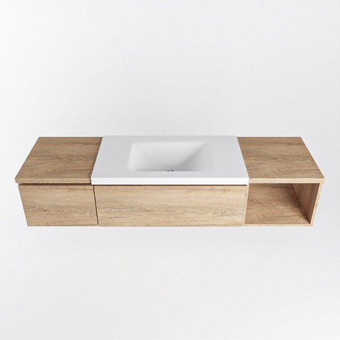 Cet ensemble de meuble rayonne de style et d'élégance avec sa couleur Chêne Blanchi et ses lignes épurées. Le module ouvert sur le côté droit ajoute une touche contemporaine et offre un espace de rangement supplémentaire. Les 2 tiroirs assurent un stockage organisé de tous vos accessoires de salle de bain, tandis que le lavabo CLOUD au centre avec 1 trou de robinet dans la couleur Talc donne une allure raffinée à l'ensemble.