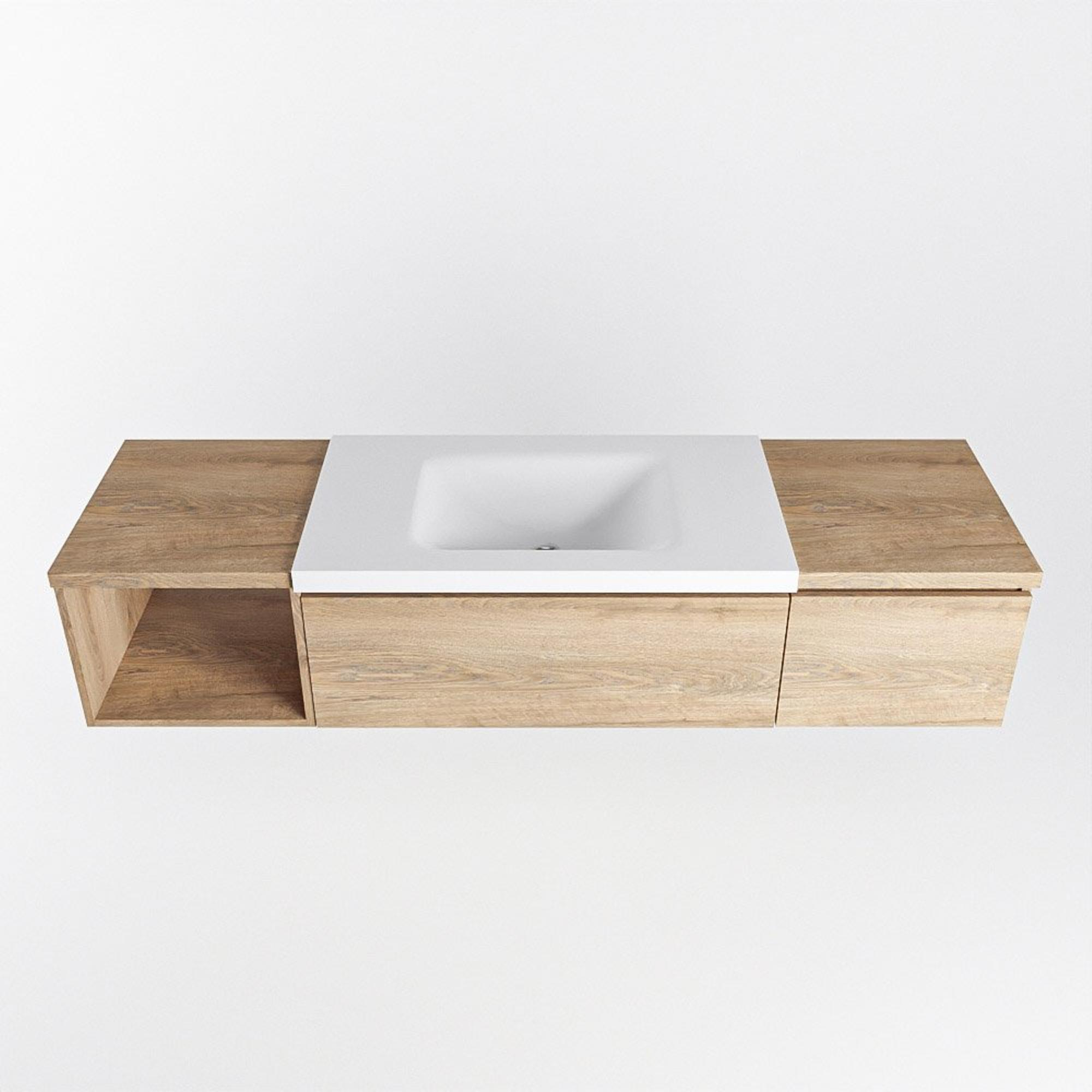MONDIAZ BUKLA 160cm ensemble de meuble avec module ouvert 40 gauche couleur Chêne blanchi avec 2 tiroirs. Lavabo CLOUD centre 1 trou de robinet couleur Talc.