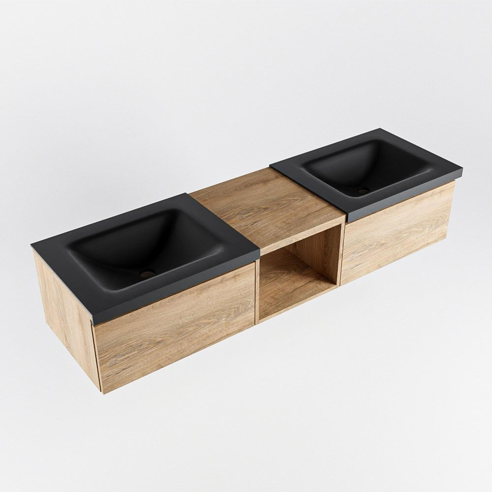 Ce meuble de salle de bain est non seulement un régal pour les yeux, mais aussi très fonctionnel. Les 2 tiroirs offrent suffisamment d'espace de rangement pour tous vos accessoires de salle de bain, tandis que le module ouvert permet de ranger des objets décoratifs ou des serviettes. Le double lavabo avec 0 trous de robinet assure un confort d'utilisation supplémentaire et rend ce meuble idéal pour un usage quotidien.