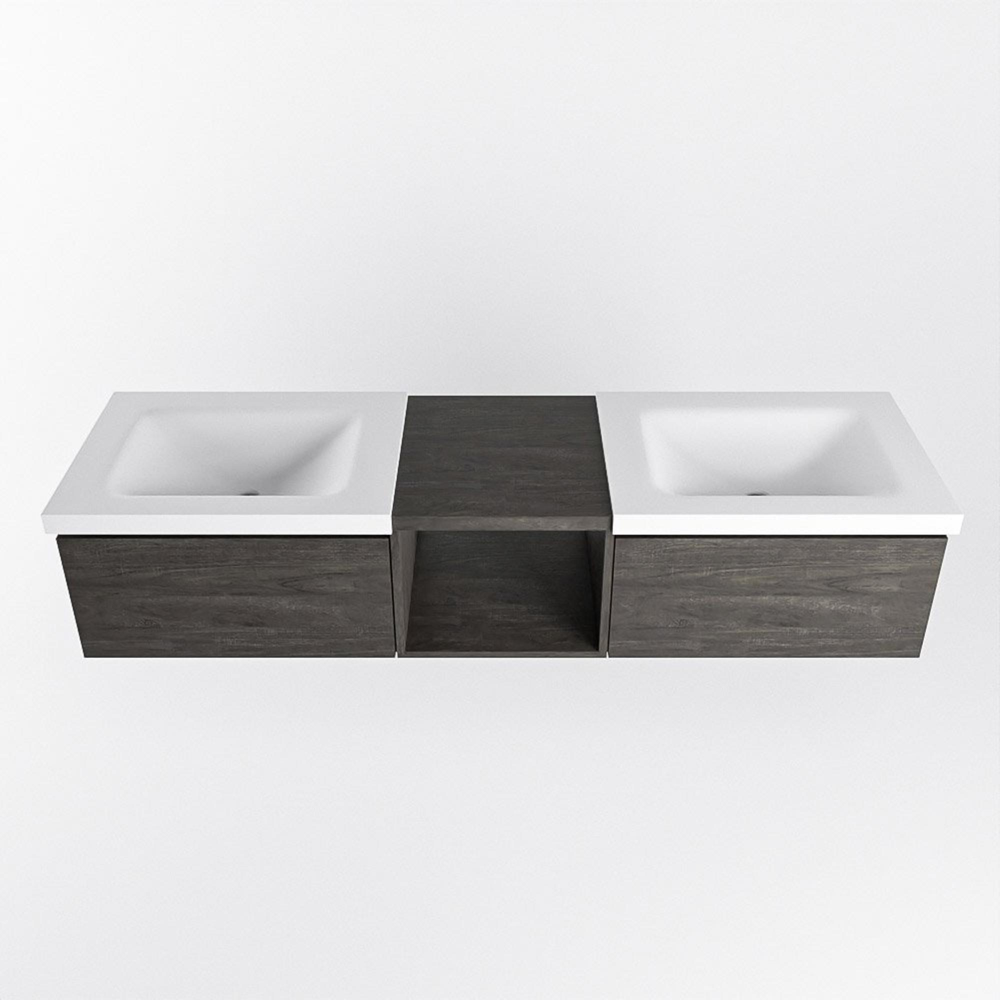 Avec ce meuble de salle de bains spacieux, vous optez pour une solution élégante et pratique pour la salle de bains familiale ou une suite parentale de luxe. L’association d’un décor bois foncé avec une double vasque blanc mat crée un ensemble sobre et moderne qui s’intègre facilement aussi bien dans les salles de bains design épurées que dans les intérieurs chaleureux de style hôtel chic. Grâce à sa largeur généreuse de 160 cm, sa double vasque et son compartiment ouvert, ce meuble est idéal comme « hub du matin » : suffisamment d’espace pour l’utiliser à deux, mais aussi pour donner une place aux serviettes, paniers ou jolis accessoires. Vous cherchez un meuble suspendu qui laisse le sol dégagé, offre beaucoup d’espace de rangement tout en restant léger et moderne ? Alors cet ensemble est un choix particulièrement judicieux.