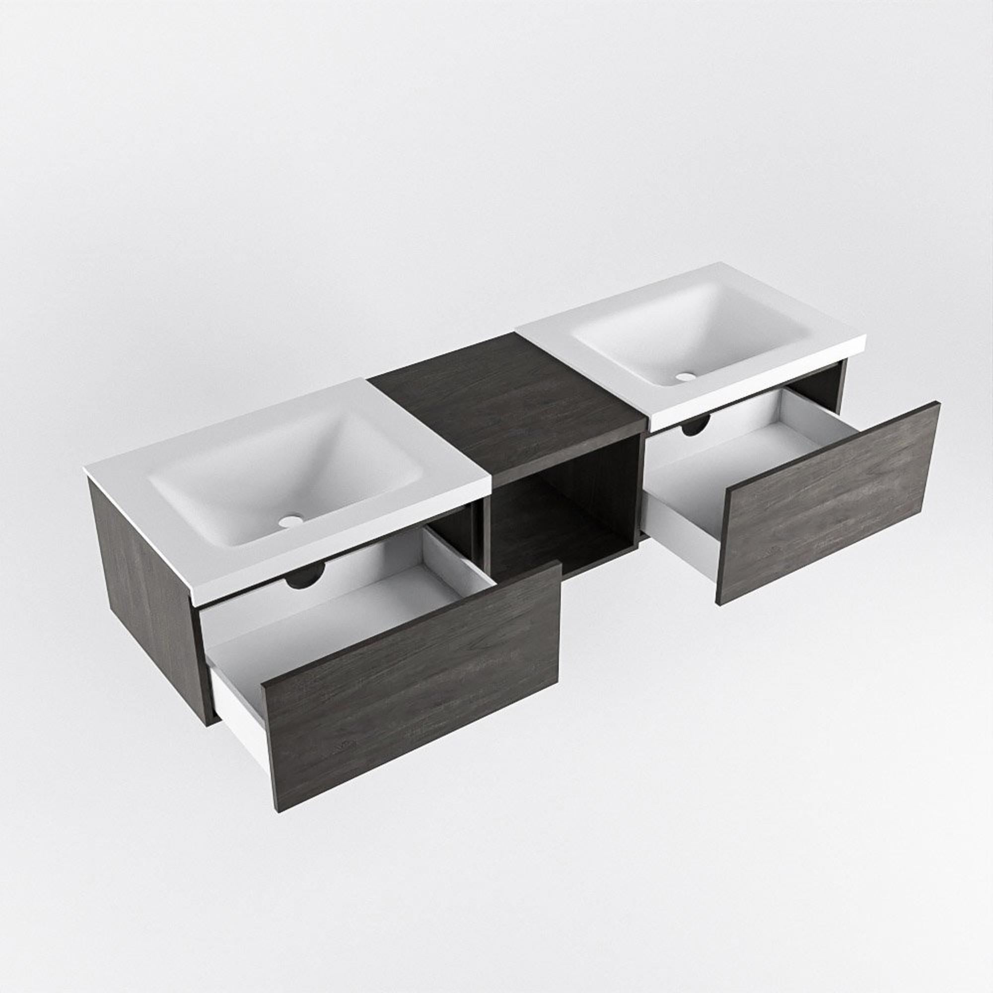 Avec une largeur de 160 cm, deux tiroirs et un compartiment ouvert de 40 cm, vous disposez de tout l’espace nécessaire pour garder votre salle de bains organisée. La double vasque facilite le brossage de dents ou la préparation du matin à deux, sans se gêner. Dans les deux grands tiroirs, vous rangez discrètement vos produits de soin, sèche-cheveux et autres accessoires de salle de bains, tandis que dans le compartiment ouvert, vous pouvez placer des serviettes ou des paniers pour tout ce que vous aimez avoir à portée de main. Comme le meuble est fixé au mur, le sol paraît dégagé et il est facile de nettoyer en dessous : agréable à l’usage et pratique pour l’hygiène.