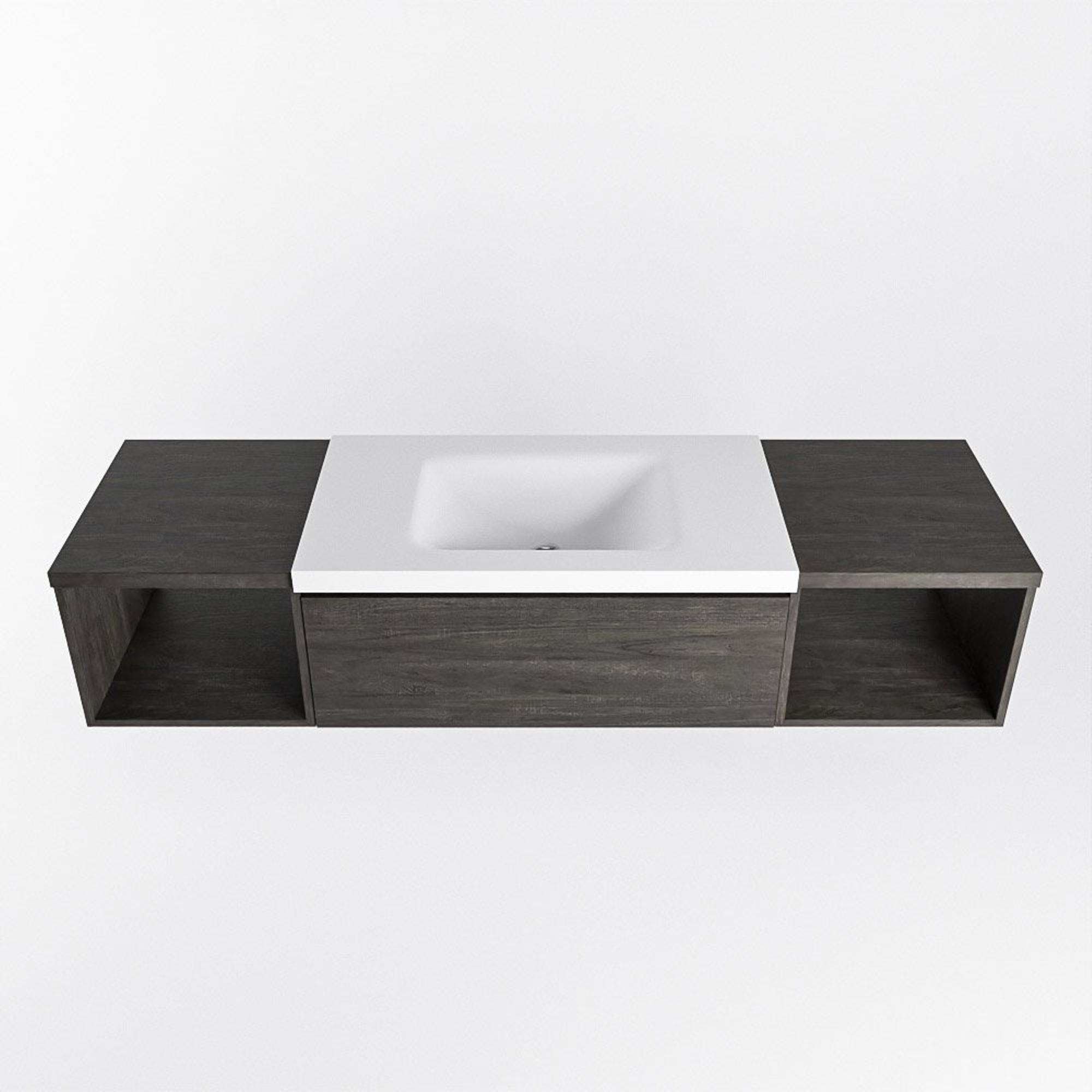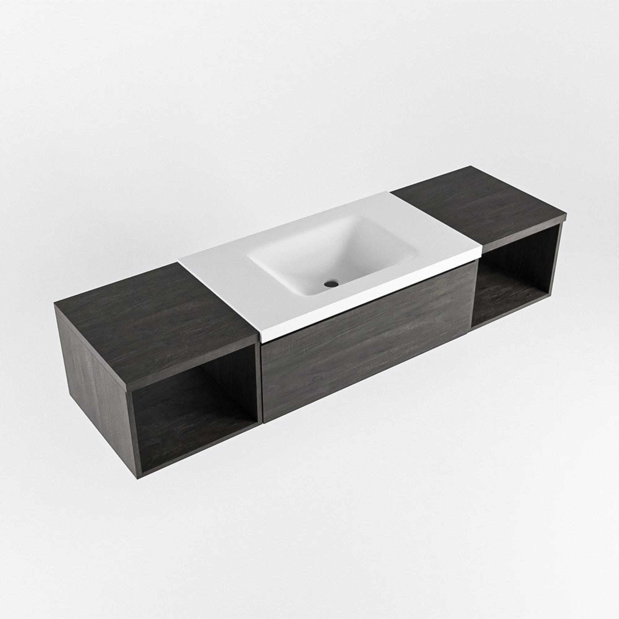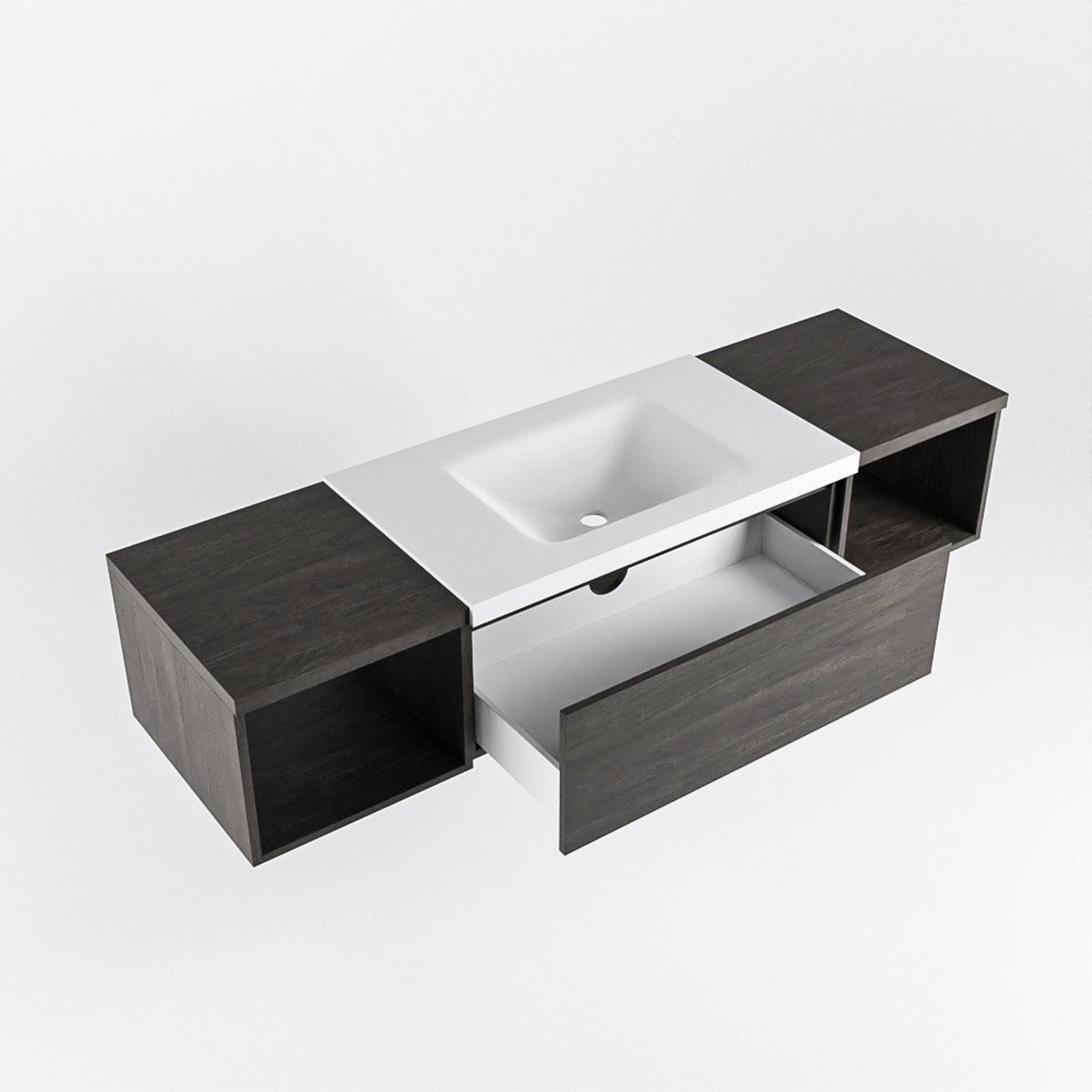 MONDIAZ BUKLA 160cm ensemble de meuble avec module ouvert 40 L+R couleur Marron foncé avec 1 tiroir. Lavabo CLOUD centre 1 trou de robinet couleur Talc.