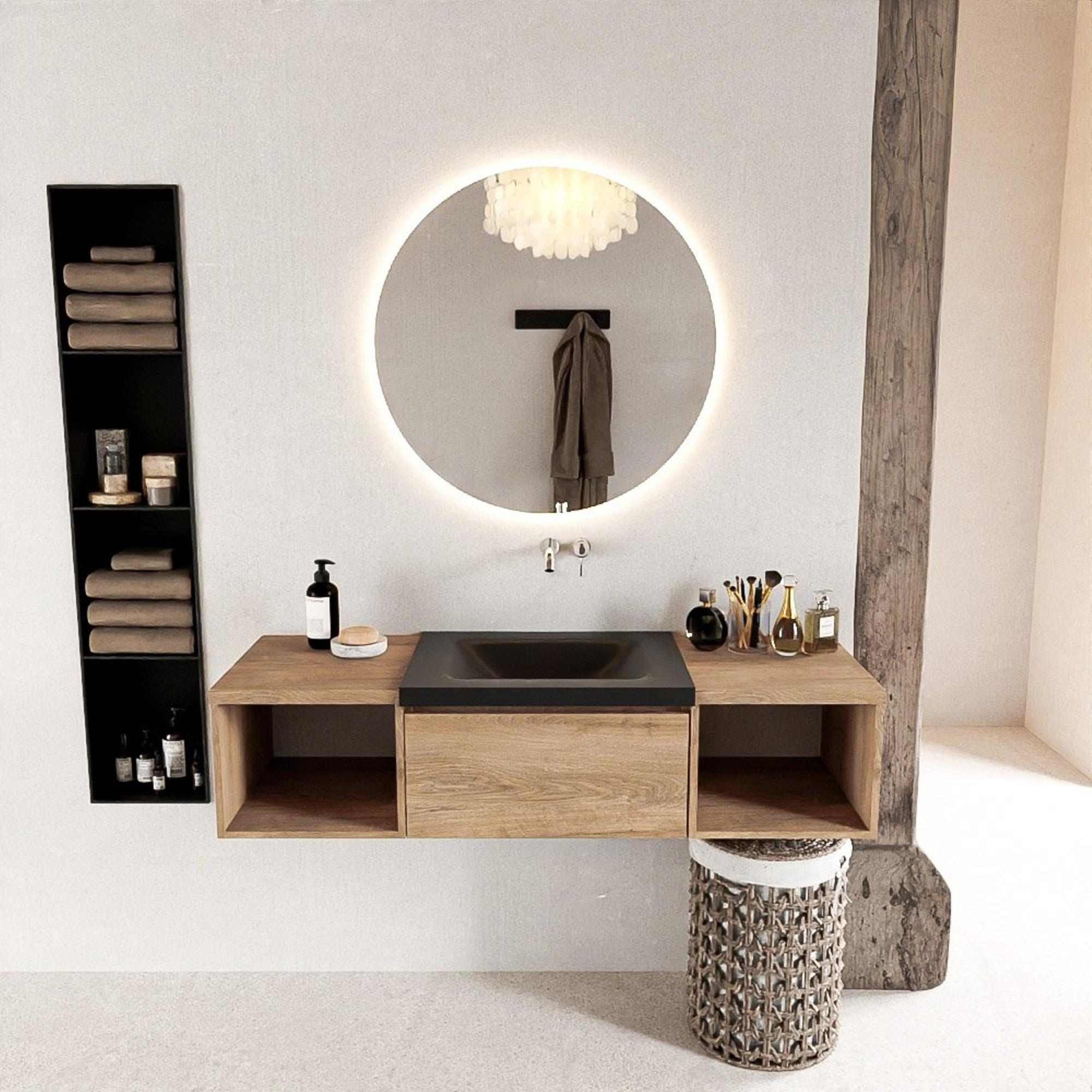 Ce meuble de salle de bain est non seulement un régal pour les yeux, mais aussi extrêmement pratique à utiliser. Le lavabo CLOUD au centre avec 0 trou de robinet offre suffisamment d'espace pour les soins quotidiens, tandis que le module ouvert crée une apparence aérée dans votre salle de bain. Les matériaux de haute qualité garantissent durabilité et utilisation prolongée, vous permettant de profiter de ce meuble de salle de bain pendant des années.