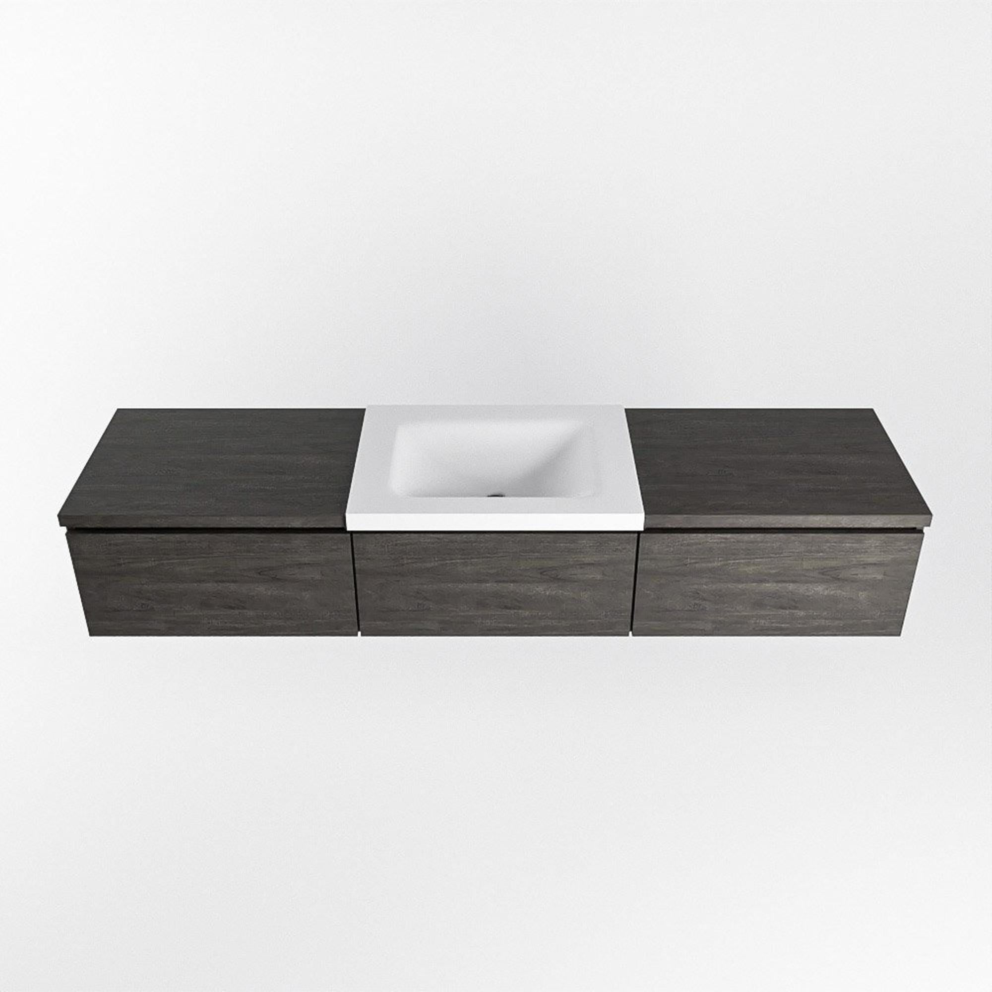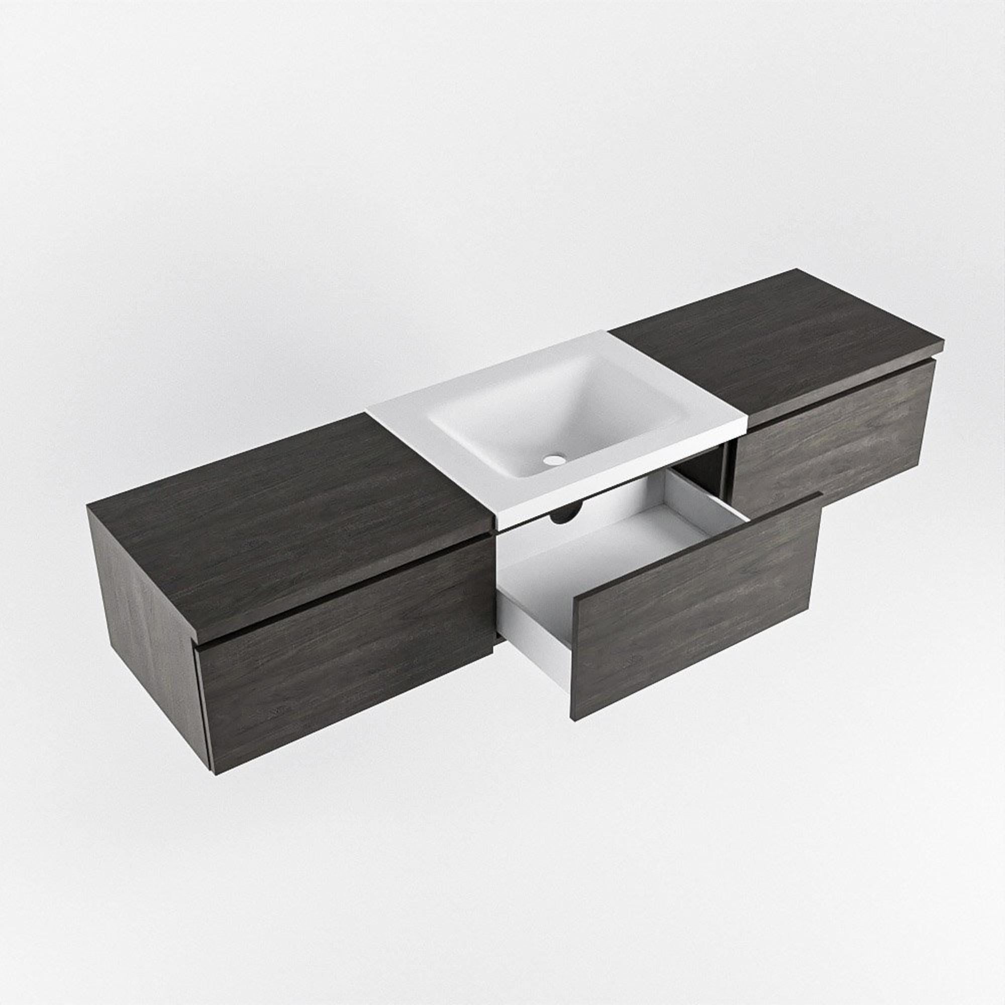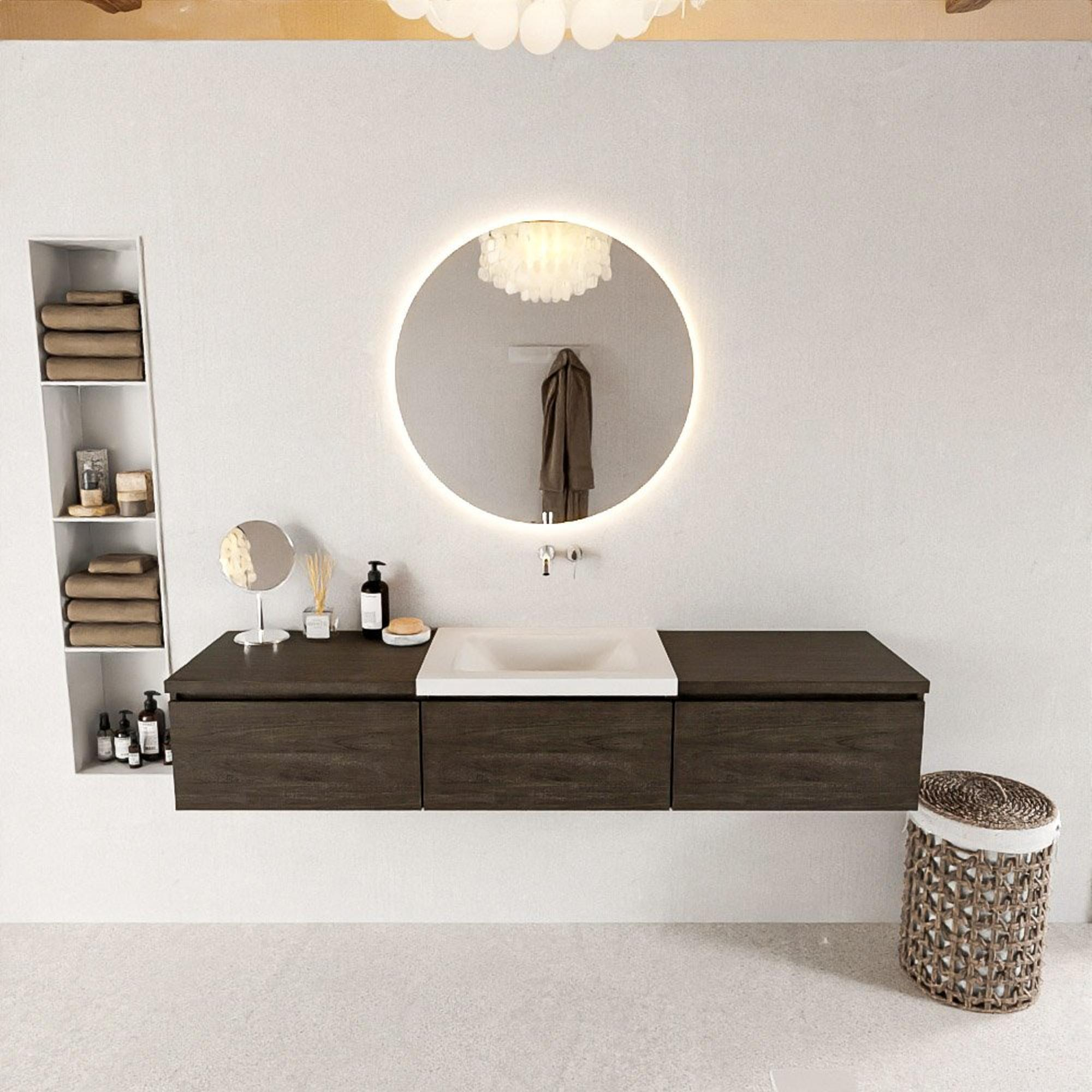 La couleur brun foncé et la structure bois donnent au meuble une apparence chaleureuse et naturelle qui se marie bien avec des carreaux aussi bien clairs que foncés. Le caisson est fabriqué en mélamine, un matériau réputé pour sa stabilité dimensionnelle, sa résistance aux rayures et sa facilité de nettoyage. Le plan et le lavabo sont réalisés en solid surface, ce qui assure des lignes épurées et sans joints et un aspect haut de gamme. Le lavabo mat blanc talc au centre forme un contraste subtil avec le meuble sombre et renforce la sensation de design dans la pièce. Ce meuble convient donc parfaitement aux salles de bains modernes, scandinaves, industrielles et hôtel-chic.