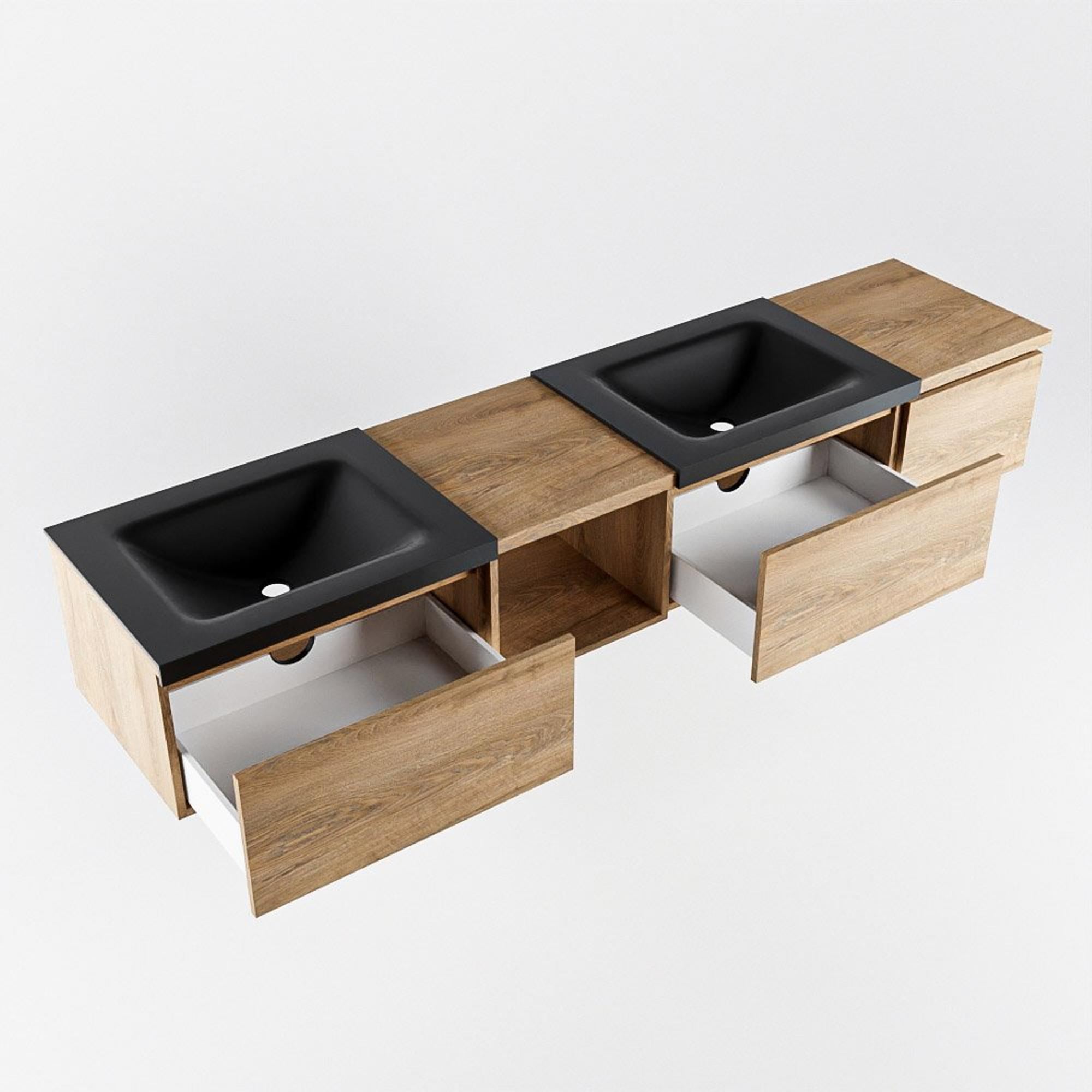 MONDIAZ BUKLA 200cm meuble de salle de bain avec module ouvert 40 à gauche couleur Chêne blanchi avec 3 tiroirs. Lavabo CLOUD double 0 trous de robinet couleur Urbaine.