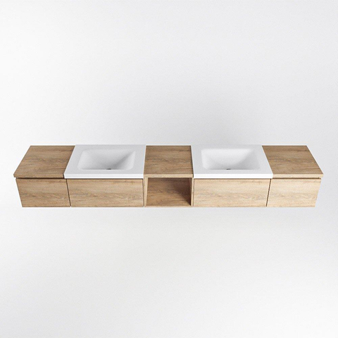 MONDIAZ BUKLA 240cm ensemble de meuble avec module ouvert 40 au milieu couleur Chêne blanchi avec 4 tiroirs. Lavabo CLOUD double 0 trou de robinet couleur Talc.