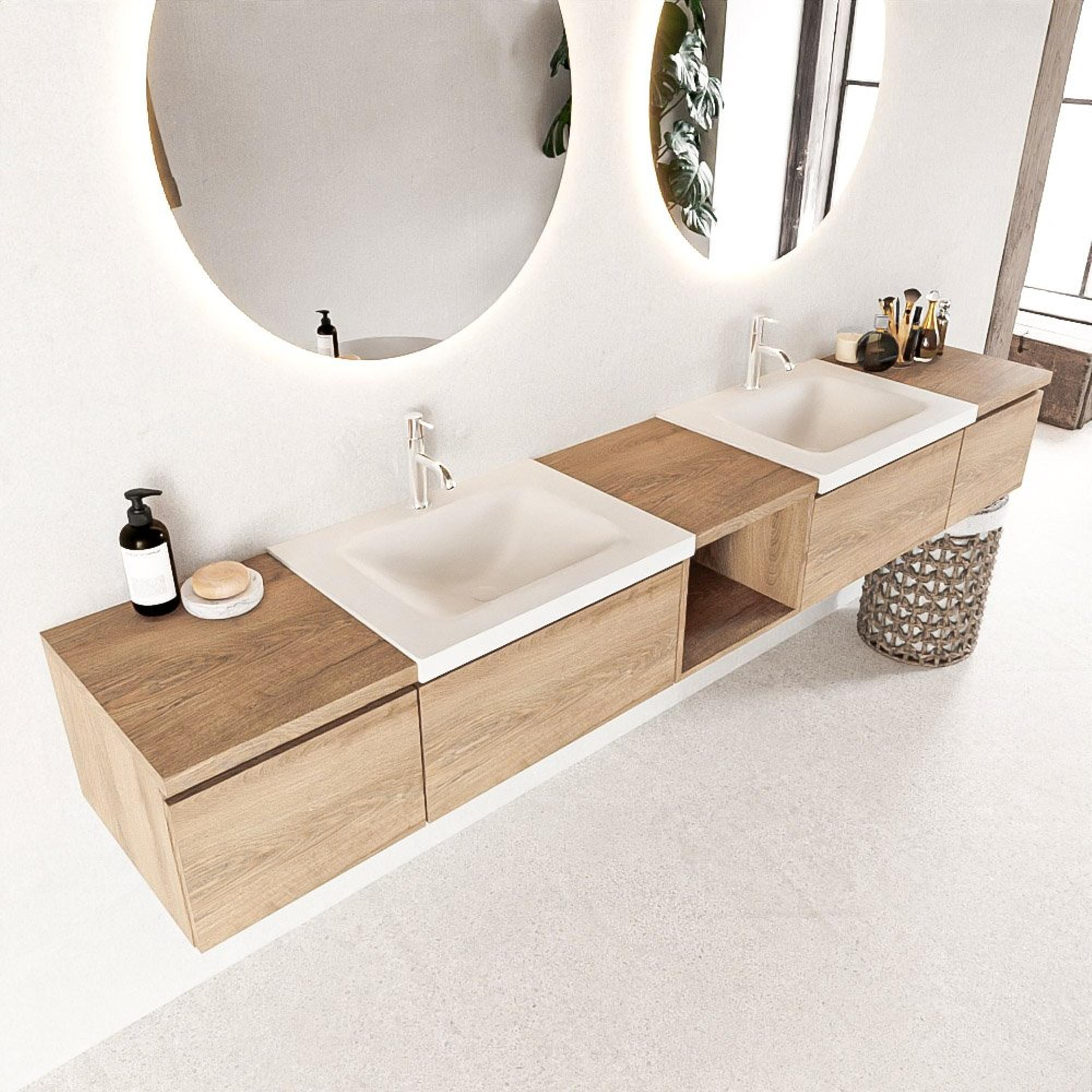 MONDIAZ BUKLA 240cm ensemble de meuble avec module ouvert 40 au milieu couleur Chêne blanchi avec 4 tiroirs. Lavabo CLOUD double 2 trous de robinet couleur Talc.