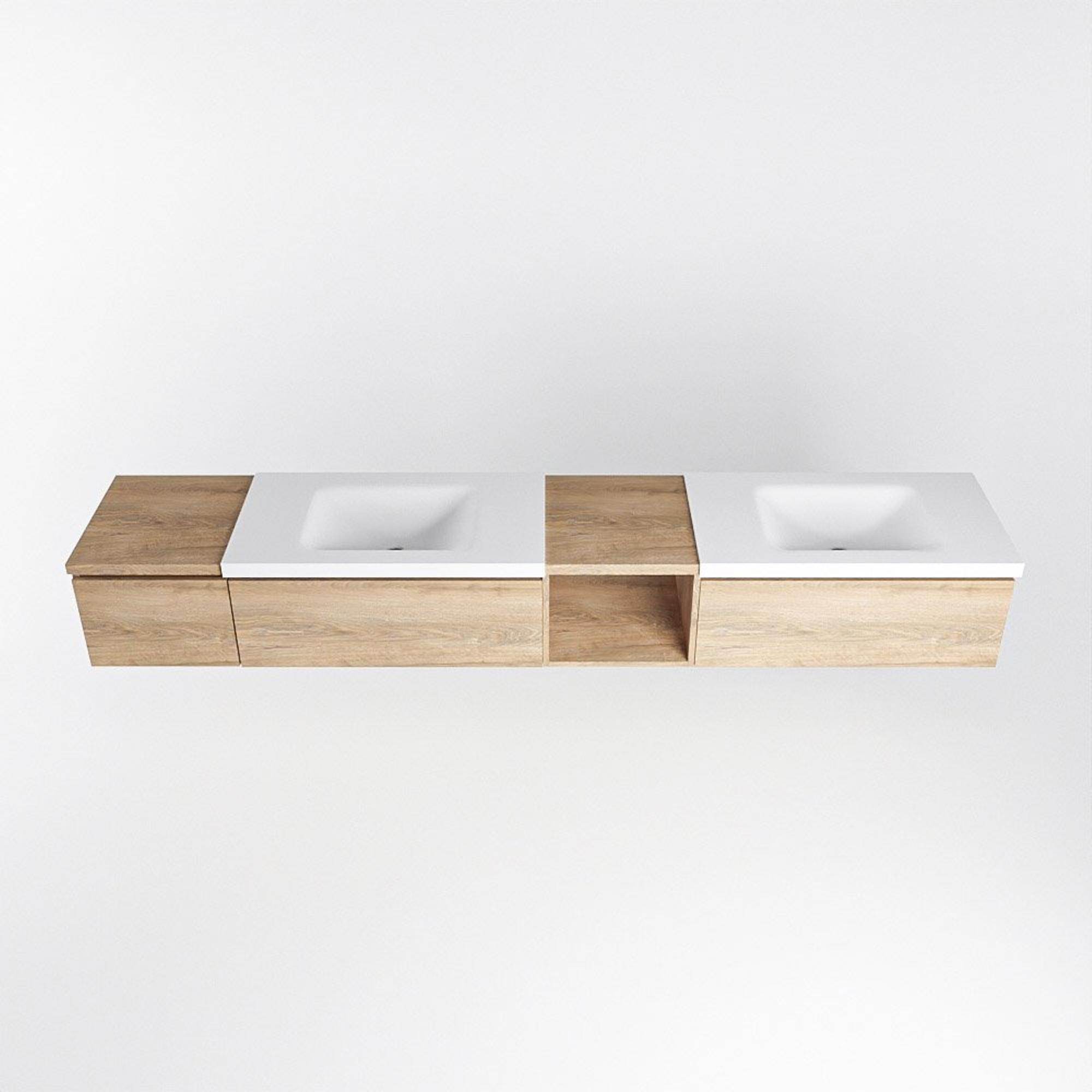 MONDIAZ BUKLA 240cm ensemble de meuble avec module ouvert 40 à droite couleur Chêne blanchi avec 3 tiroirs. Lavabo CLOUD double 2 trous de robinet couleur Talc.