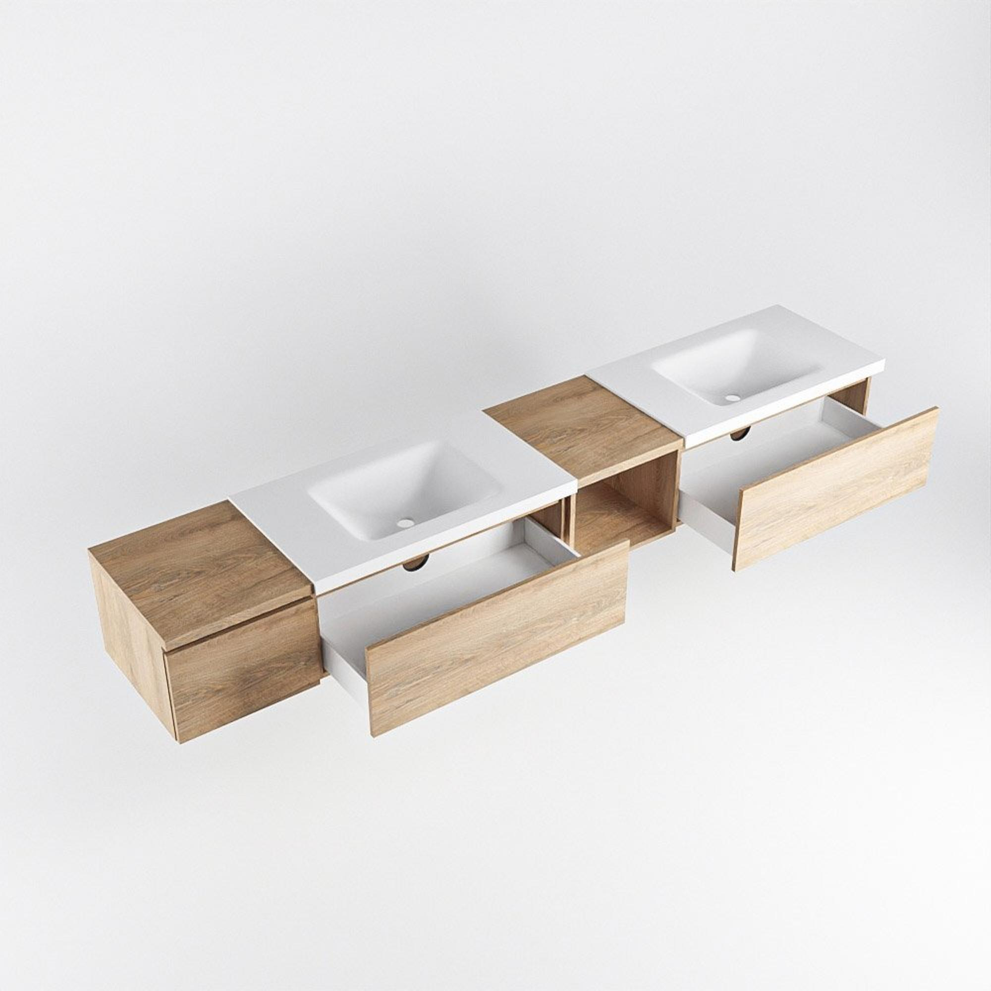 Ce magnifique meuble de salle de bain avec module ouvert et double lavabo est un véritable ajout à l'intérieur de votre salle de bain. Avec une longueur de 240 cm et une couleur Chêne Blanchi élégante, ce meuble dégage style et fonctionnalité. Les 3 tiroirs offrent suffisamment d'espace de rangement, tandis que le double lavabo CLOUD avec 2 trous de robinet dans la couleur Talc assure un confort et une commodité ultimes dans votre routine quotidienne.
