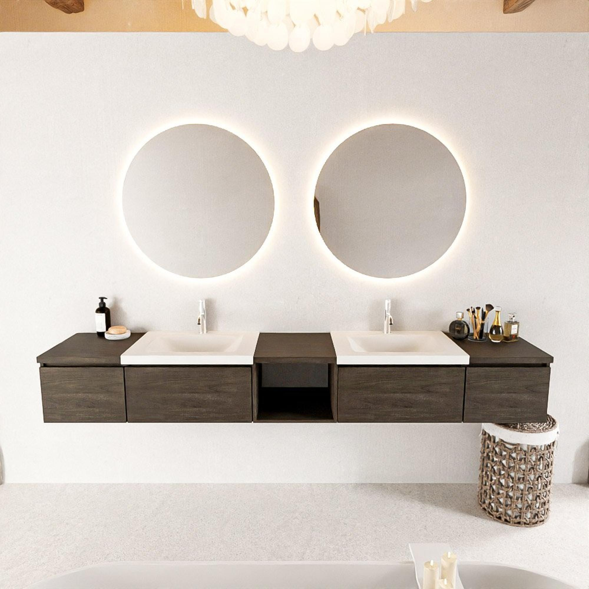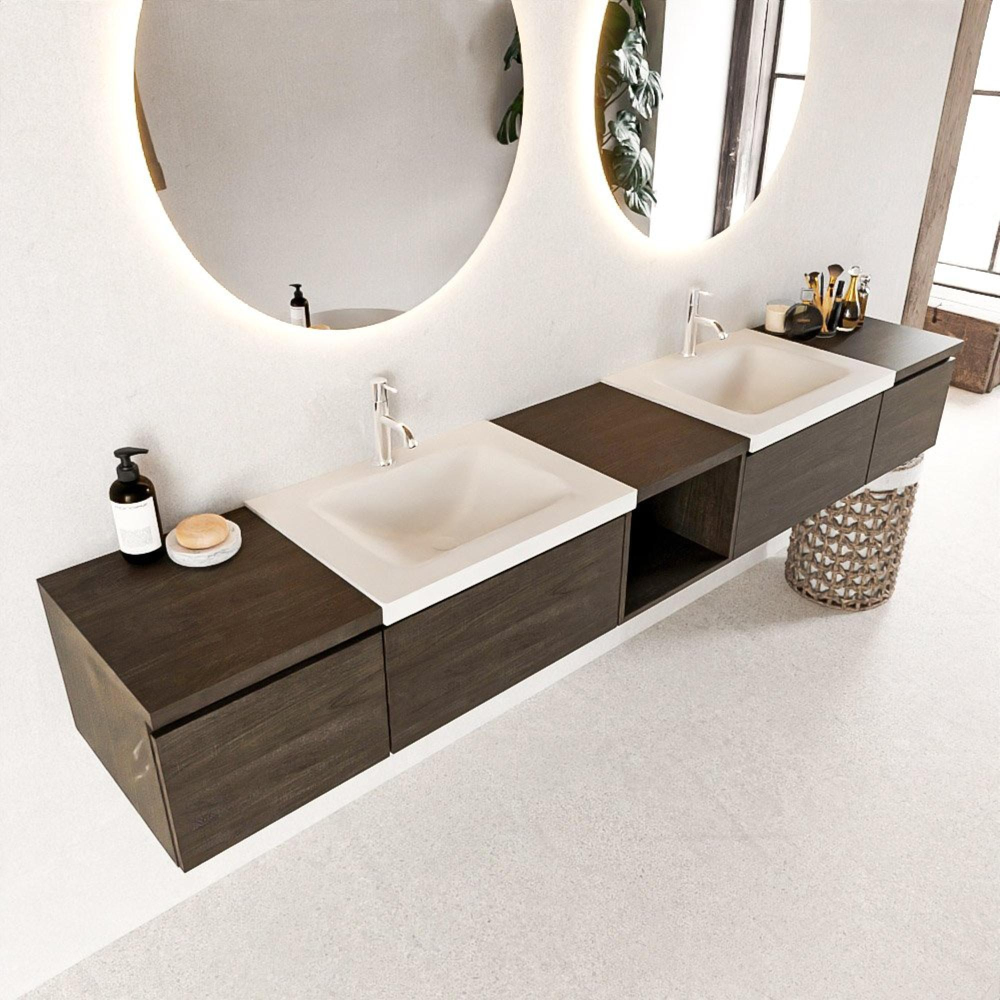 MONDIAZ BUKLA 240cm ensemble de meuble avec module ouvert 40 au milieu couleur Marron foncé avec 4 tiroirs. Lavabo CLOUD double 2 trous de robinet couleur Talc.