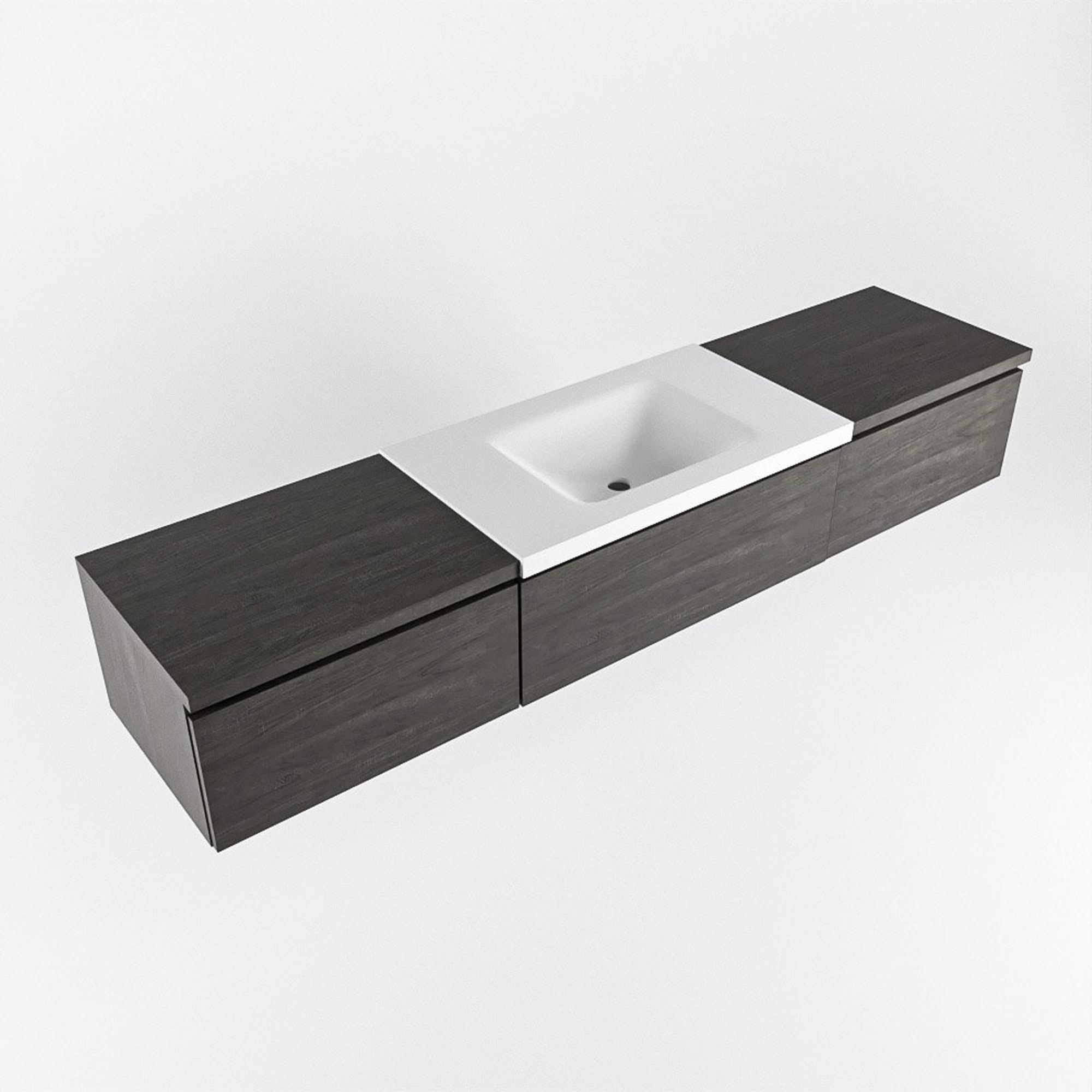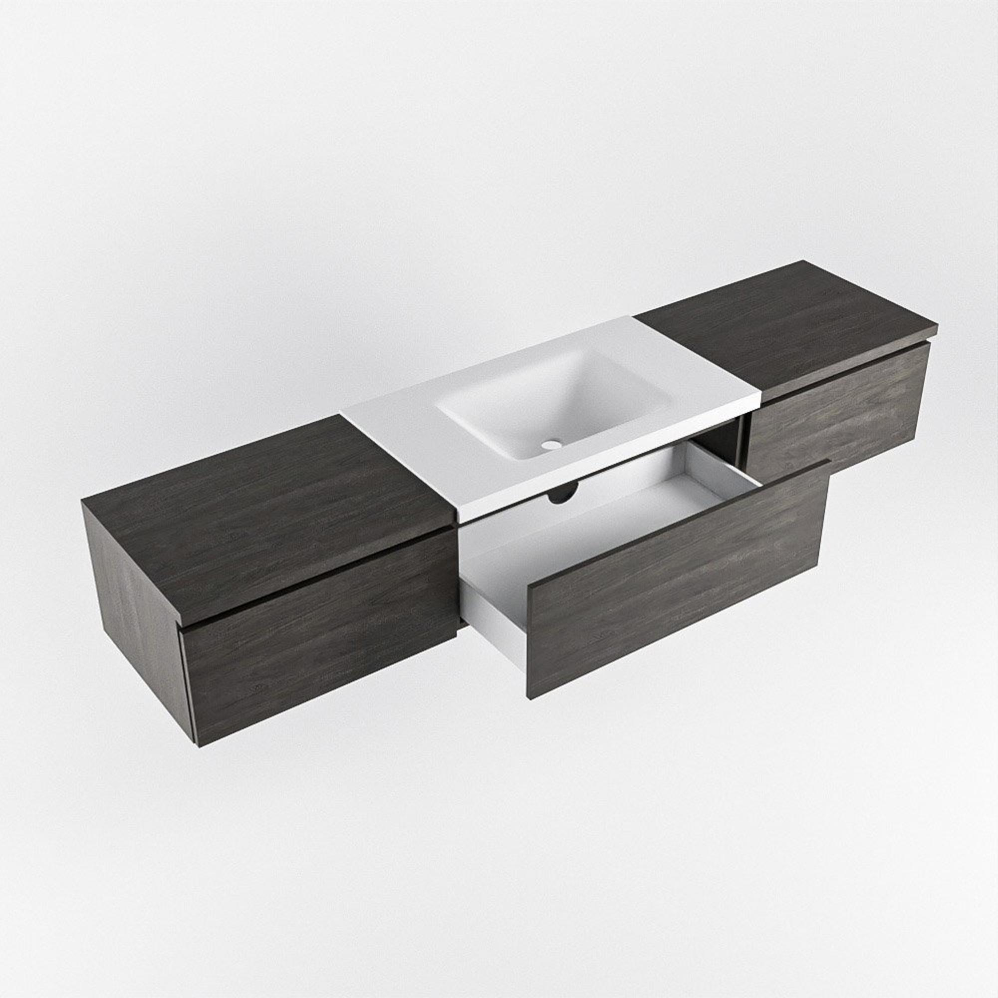 La couleur Dark Brown du meuble apporte immédiatement plus de chaleur et d’ambiance à votre salle de bains. Cette teinte se marie à merveille avec des matériaux naturels comme des carreaux effet bois, mais aussi avec un béton brut ou des murs blancs épurés. La texture subtile des façades crée une profondeur supplémentaire dans l’ensemble, sans que cela paraisse trop chargé. En choisissant cette teinte bois foncé, vous créez une allure luxueuse, presque digne d’un spa, surtout si vous la combinez avec des accessoires noirs ou en métal brossé. Le meuble forme ainsi une base élégante pour la salle de bains de vos rêves, que vous imaginiez un espace bien-être serein ou une salle de bains familiale conviviale.