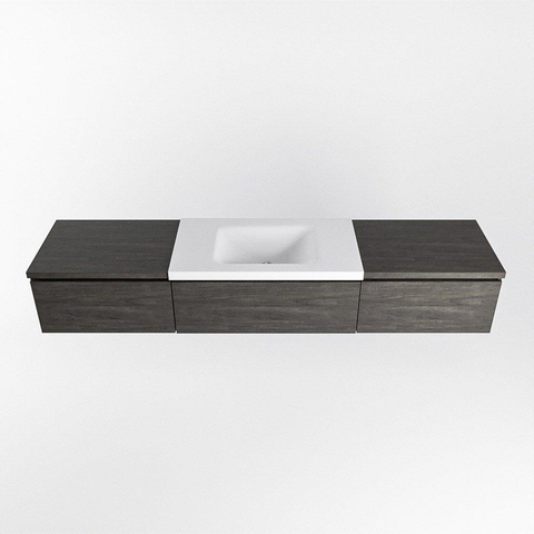 Avec une largeur de 200 cm et trois grands tiroirs, ce meuble offre largement assez de place pour toutes vos affaires de salle de bains au quotidien. Pensez aux serviettes, produits de soin, sèche-cheveux et flacons de réserve : chacun trouve sa place fixe, ce qui permet de garder le plan du lavabo calme et bien rangé. Les façades sans poignées assurent un look épuré et minimaliste sans interruption, qui s’exprime particulièrement bien dans les salles de bains modernes ou scandinaves. Comme le meuble est fixé flottant au mur, la salle de bains paraît plus spacieuse et vous nettoyez en plus facilement le sol en dessous. Vous combinez ainsi une sensation de rangement avec un jeu de lignes intemporel et épuré.