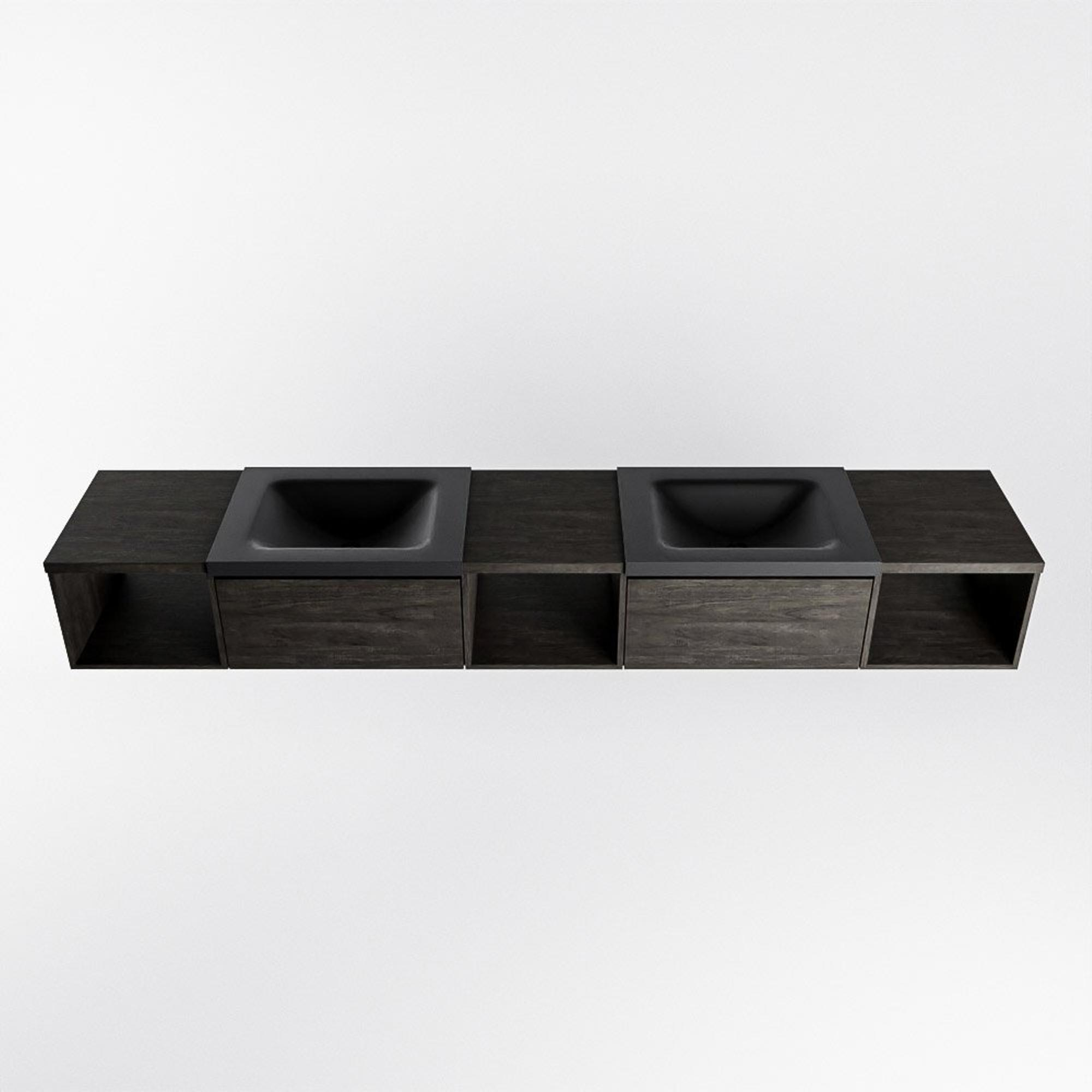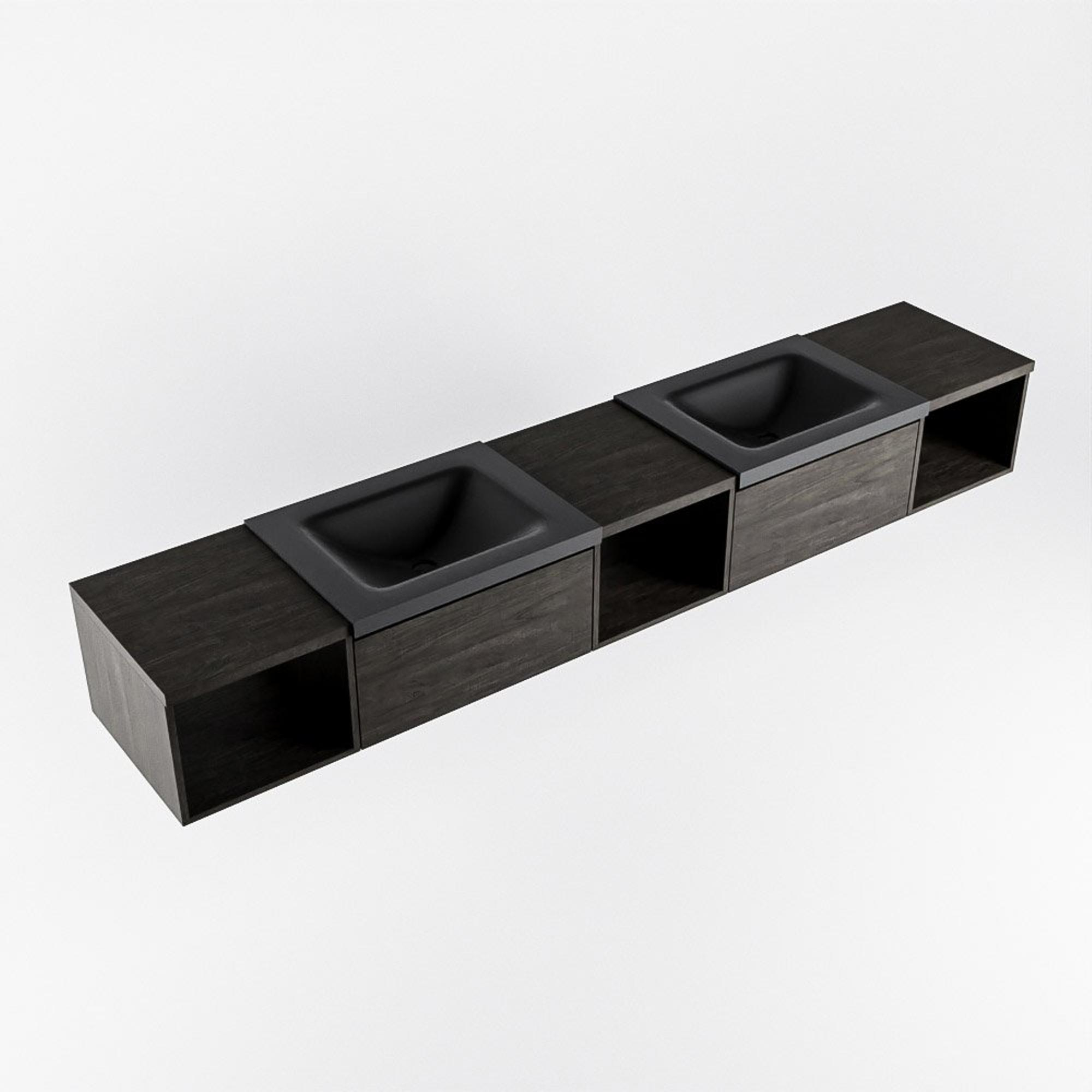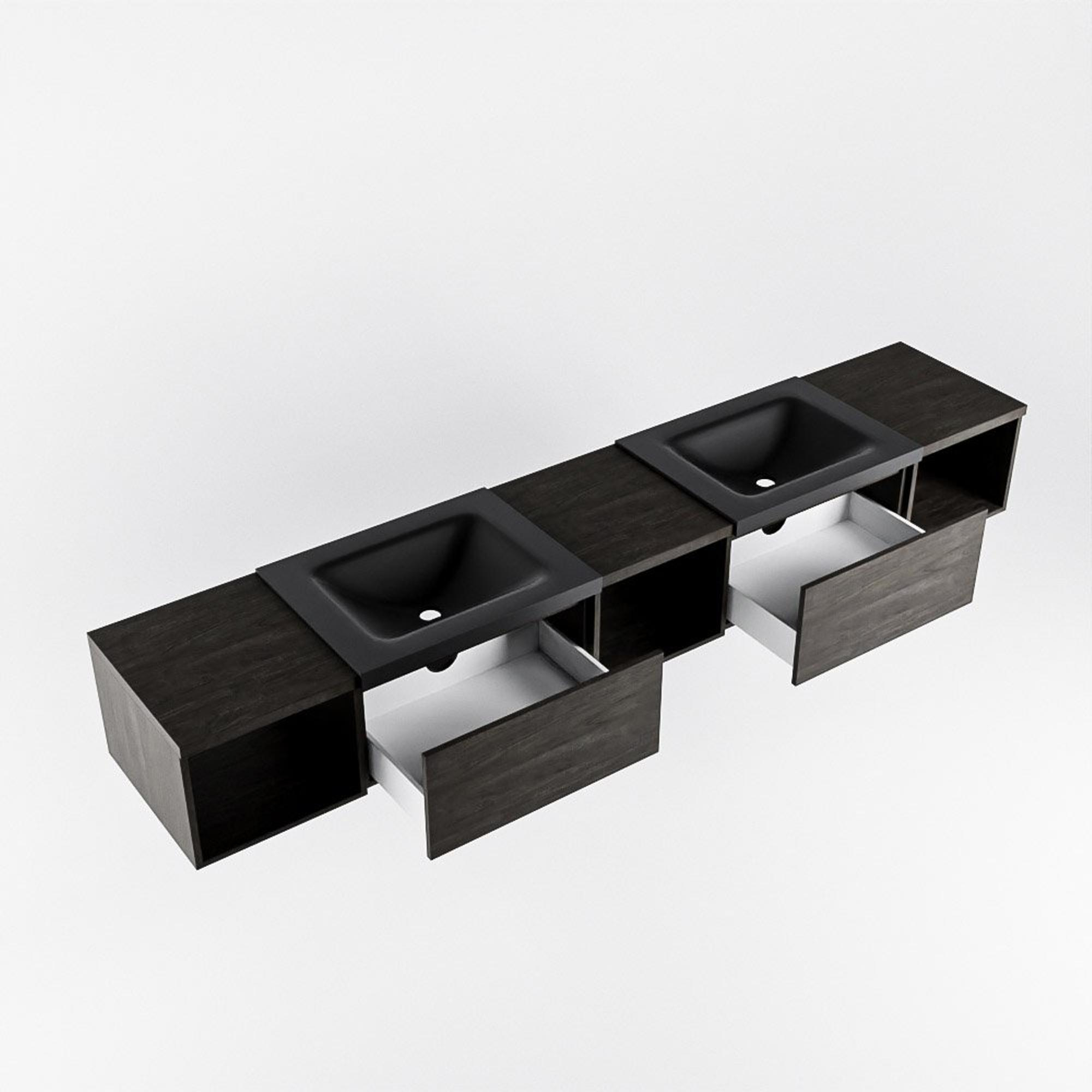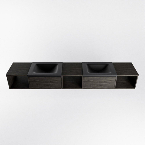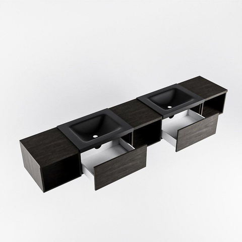 MONDIAZ BUKLA 240cm ensemble de meuble avec module ouvert 40 L+M+R couleur Marron Foncé avec 2 tiroirs. Lavabo CLOUD double 2 trous de robinet couleur Urban.
