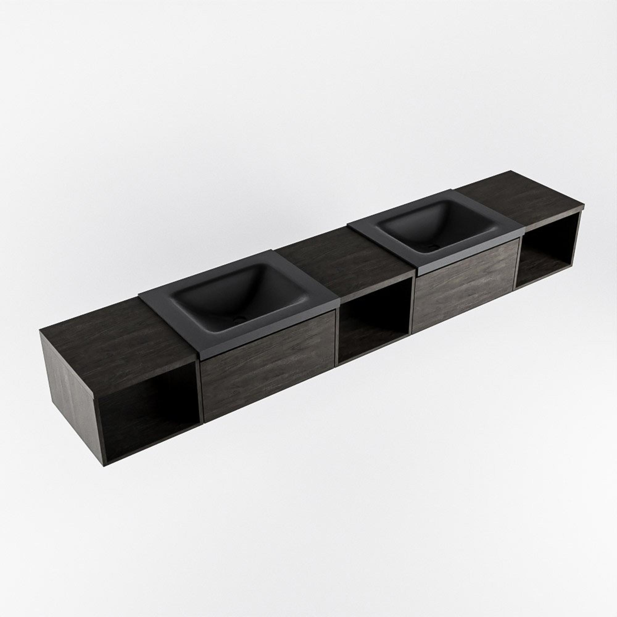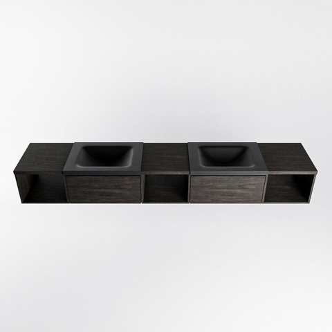 MONDIAZ BUKLA 240cm ensemble de meuble avec module ouvert 40 L+M+R couleur Marron foncé avec 2 tiroirs. Lavabo CLOUD double 0 trou de robinet couleur Urban.