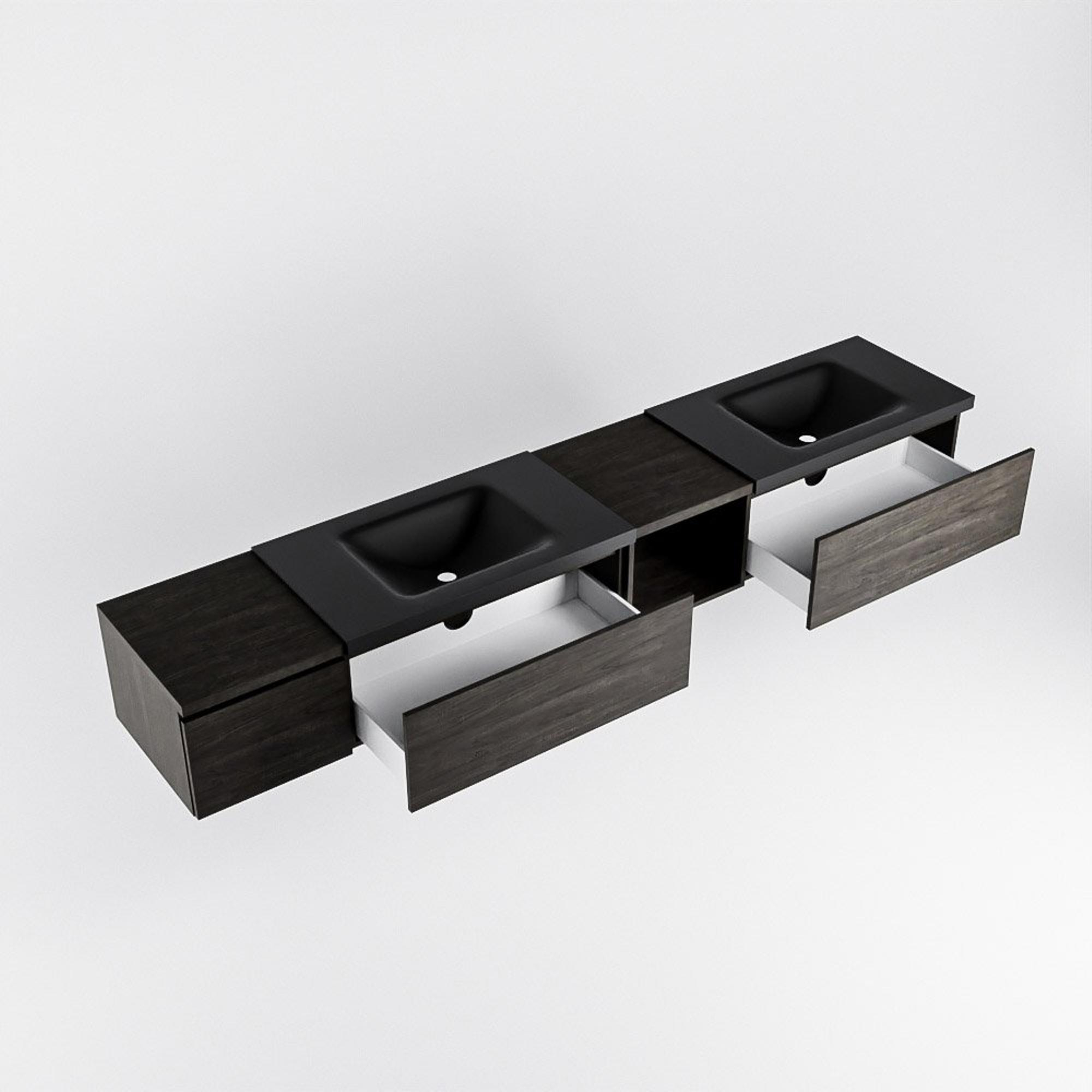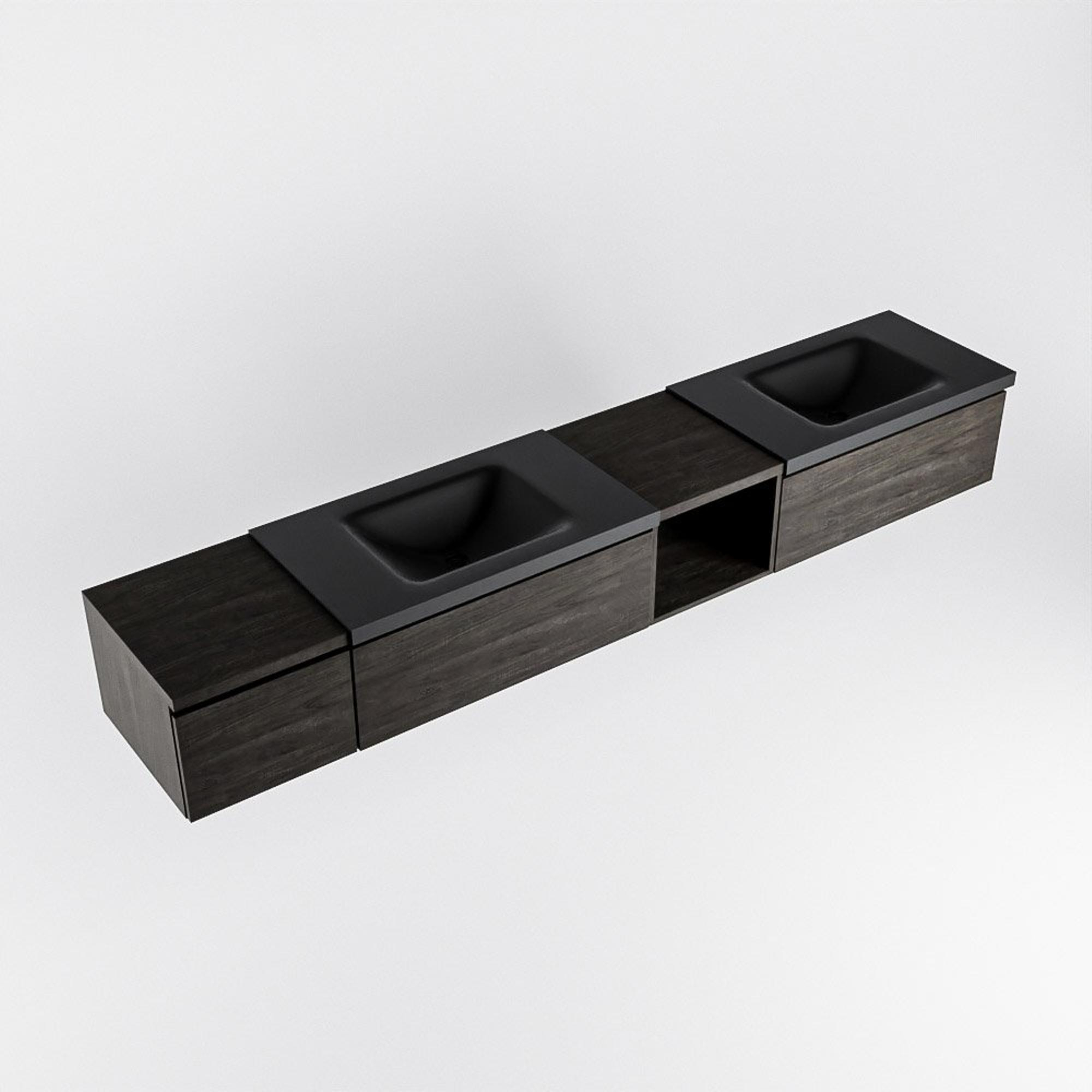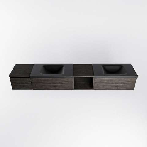 MONDIAZ BUKLA 240cm ensemble de meuble avec module ouvert 40 à droite couleur Marron Foncé avec 3 tiroirs. Lavabo CLOUD double 0 trou de robinet couleur Urban.