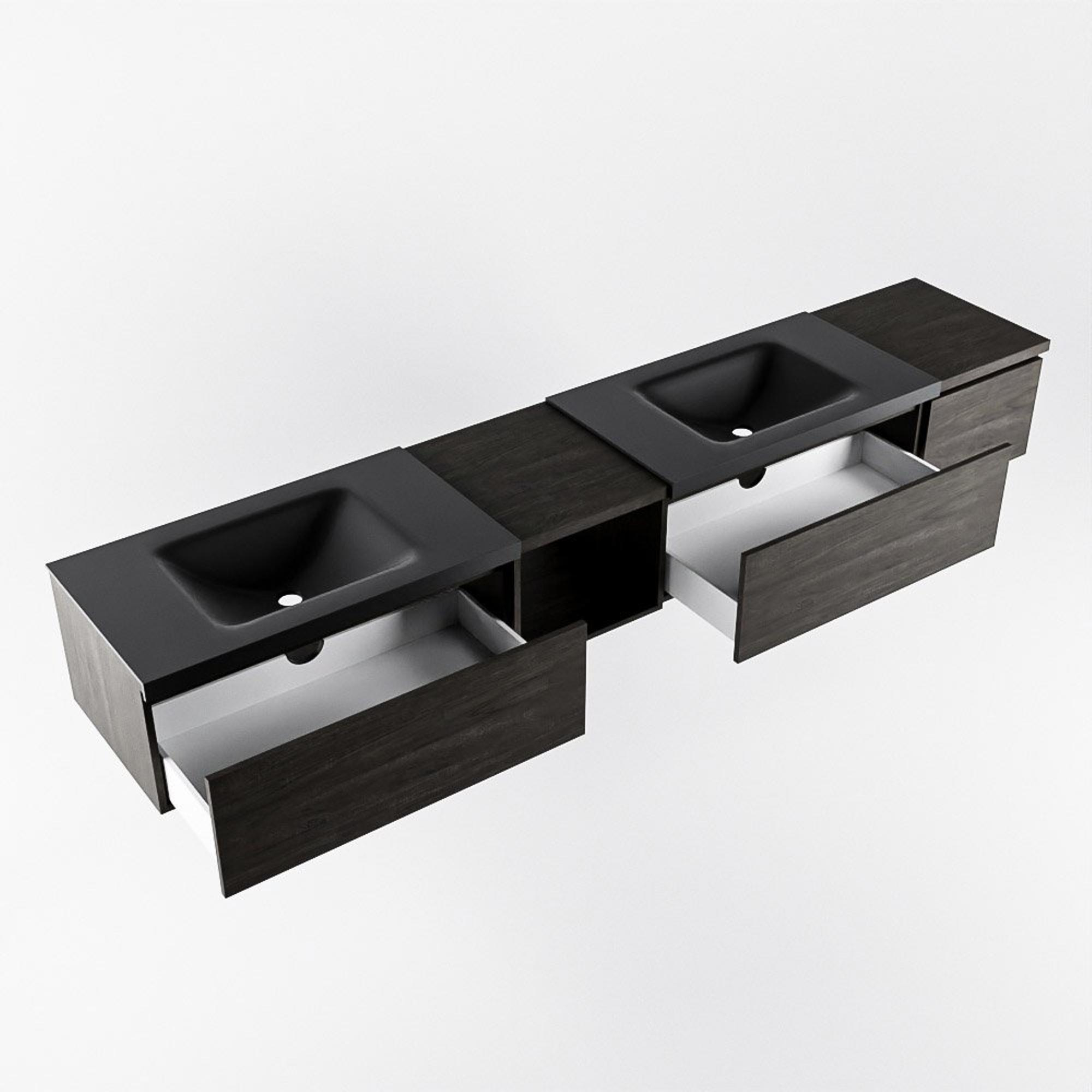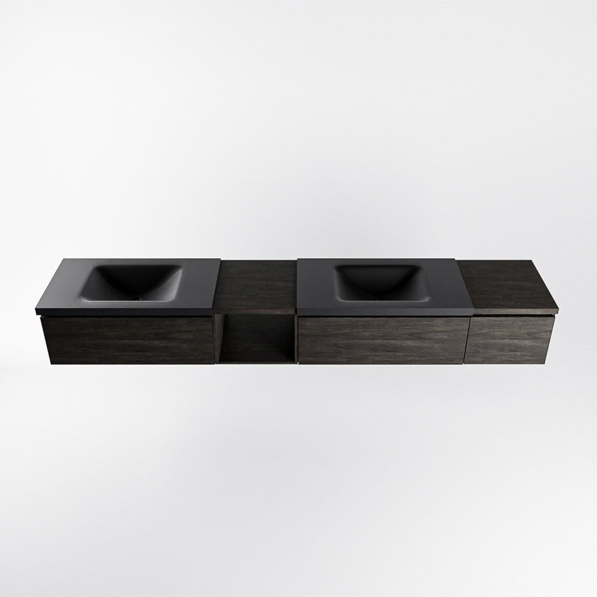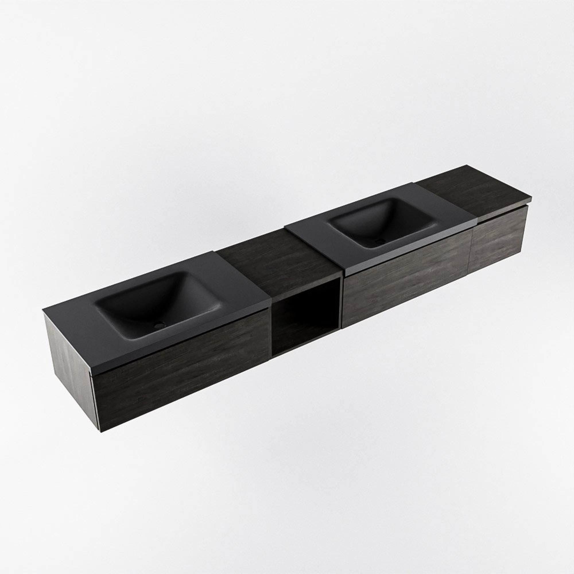 MONDIAZ BUKLA 240cm ensemble de meuble avec module ouvert 40 gauche couleur Marron Foncé avec 3 tiroirs. Lavabo CLOUD double 2 trous de robinet couleur Urban.