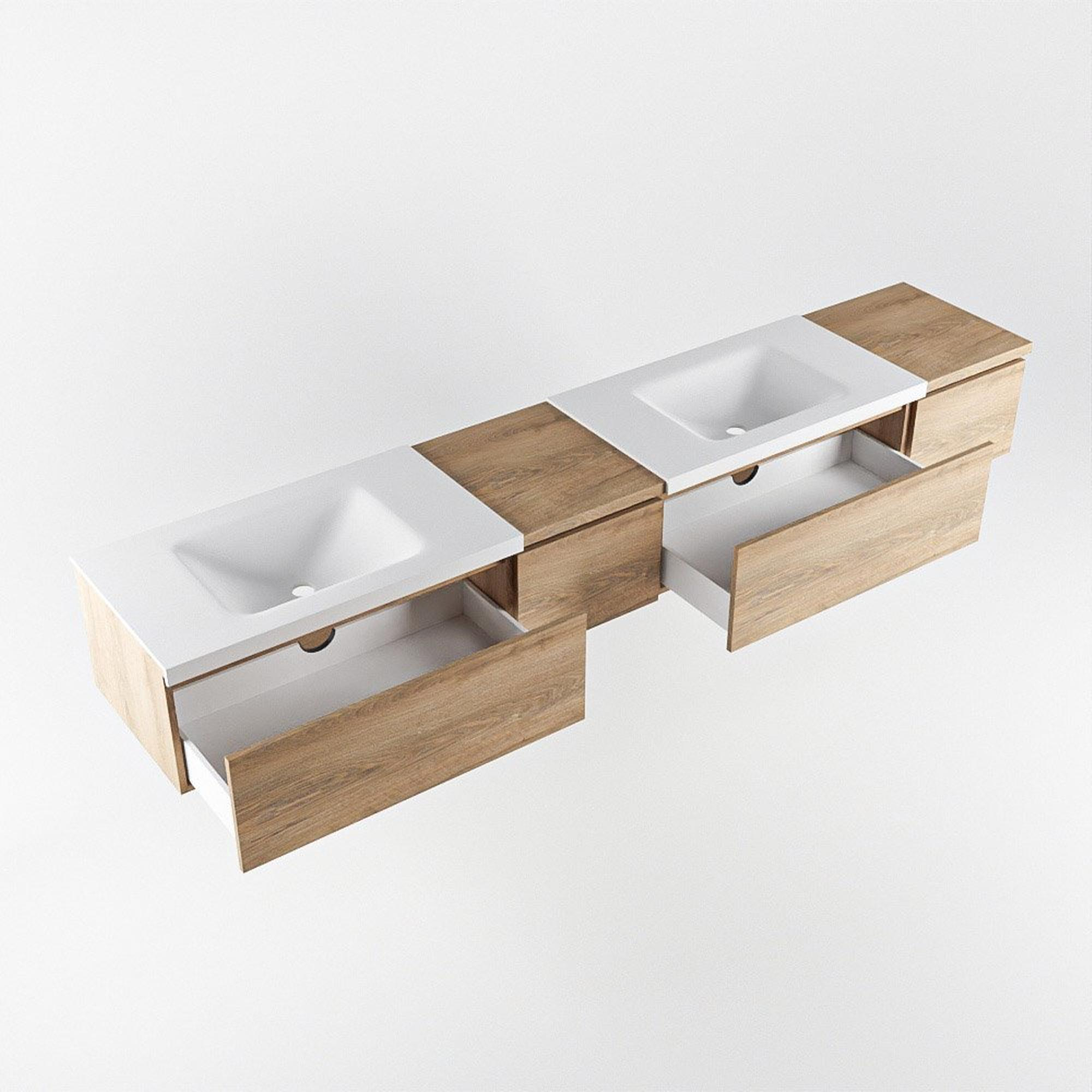 Découvrez l'apparence raffinée de ce meuble de salle de bain, fabriqué dans la magnifique couleur Chêne Blanchi. Les lignes épurées et la finition moderne assurent une élégance intemporelle dans votre salle de bain. Les 4 tiroirs offrent suffisamment d'espace de rangement pour tous vos accessoires de salle de bain, tandis que le double lavabo avec 2 trous de robinet garantit un confort ultime.