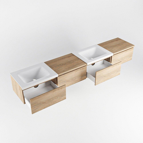 MONDIAZ BUKLA 240cm ensemble de meuble avec module 60 à droite couleur Chêne blanchi avec 4 tiroirs. Lavabo CLOUD double 0 trou de robinet couleur Talc.