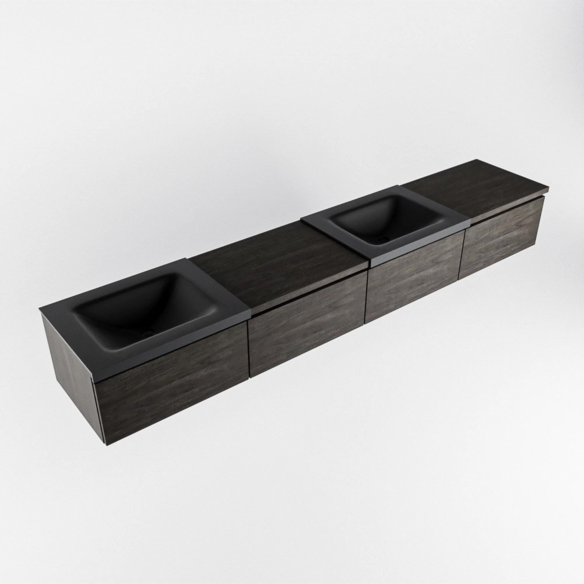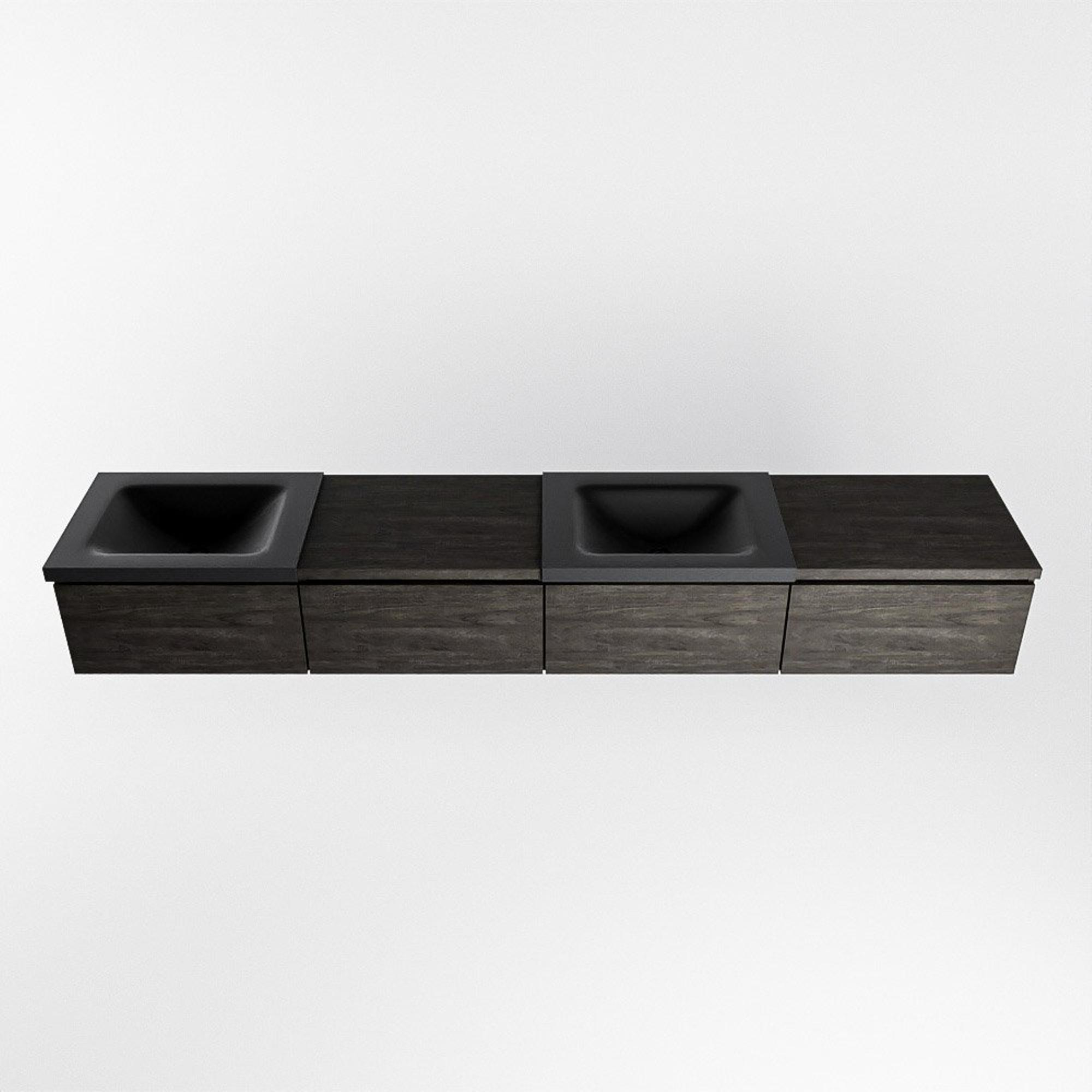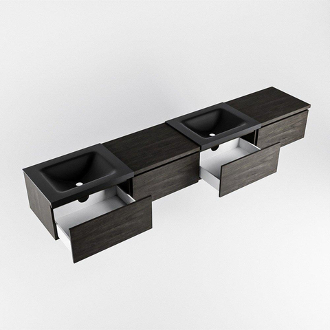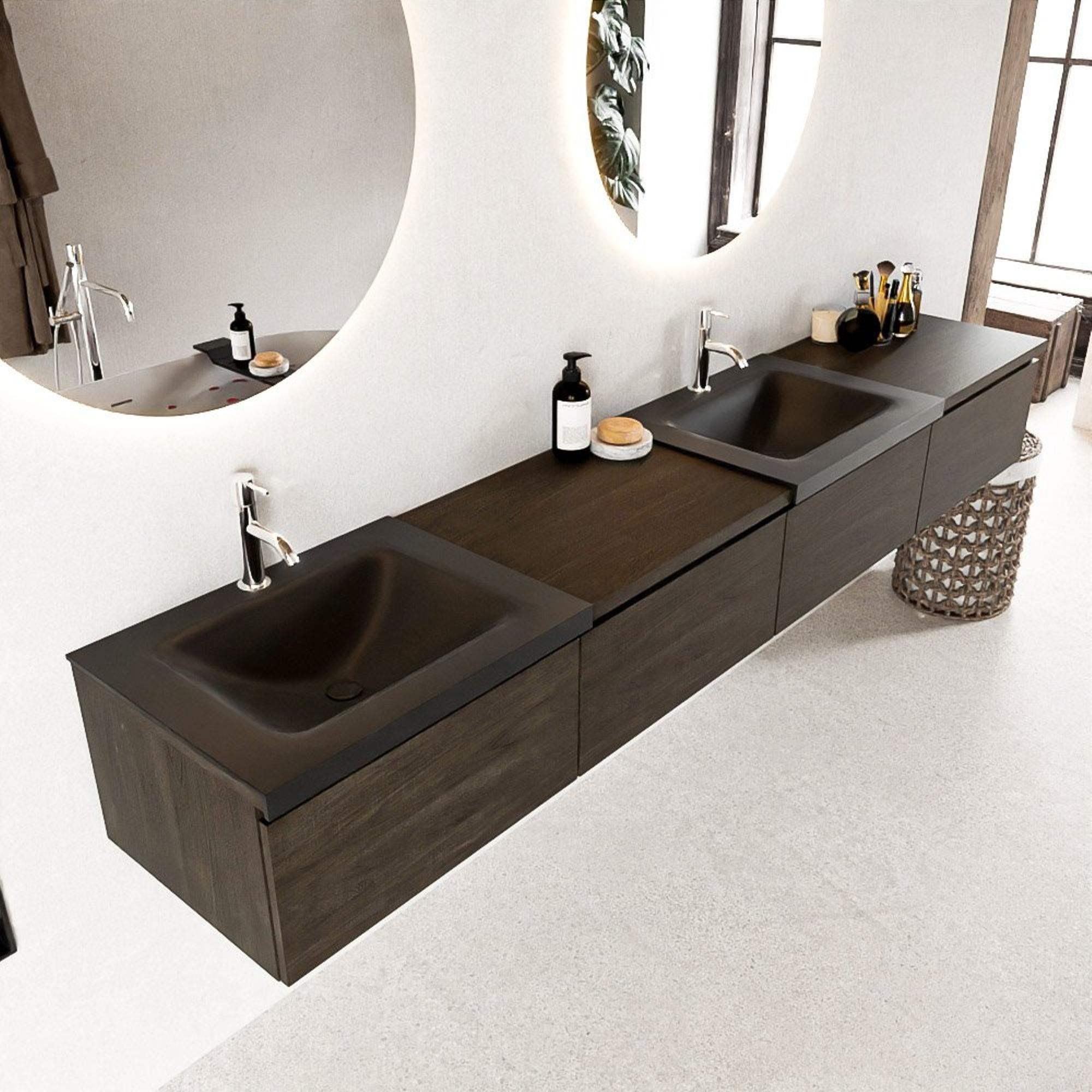 MONDIAZ BUKLA 240cm ensemble de meuble avec module 60 à droite couleur Marron Foncé avec 4 tiroirs. Lavabo CLOUD double 2 trous de robinet couleur Urban.