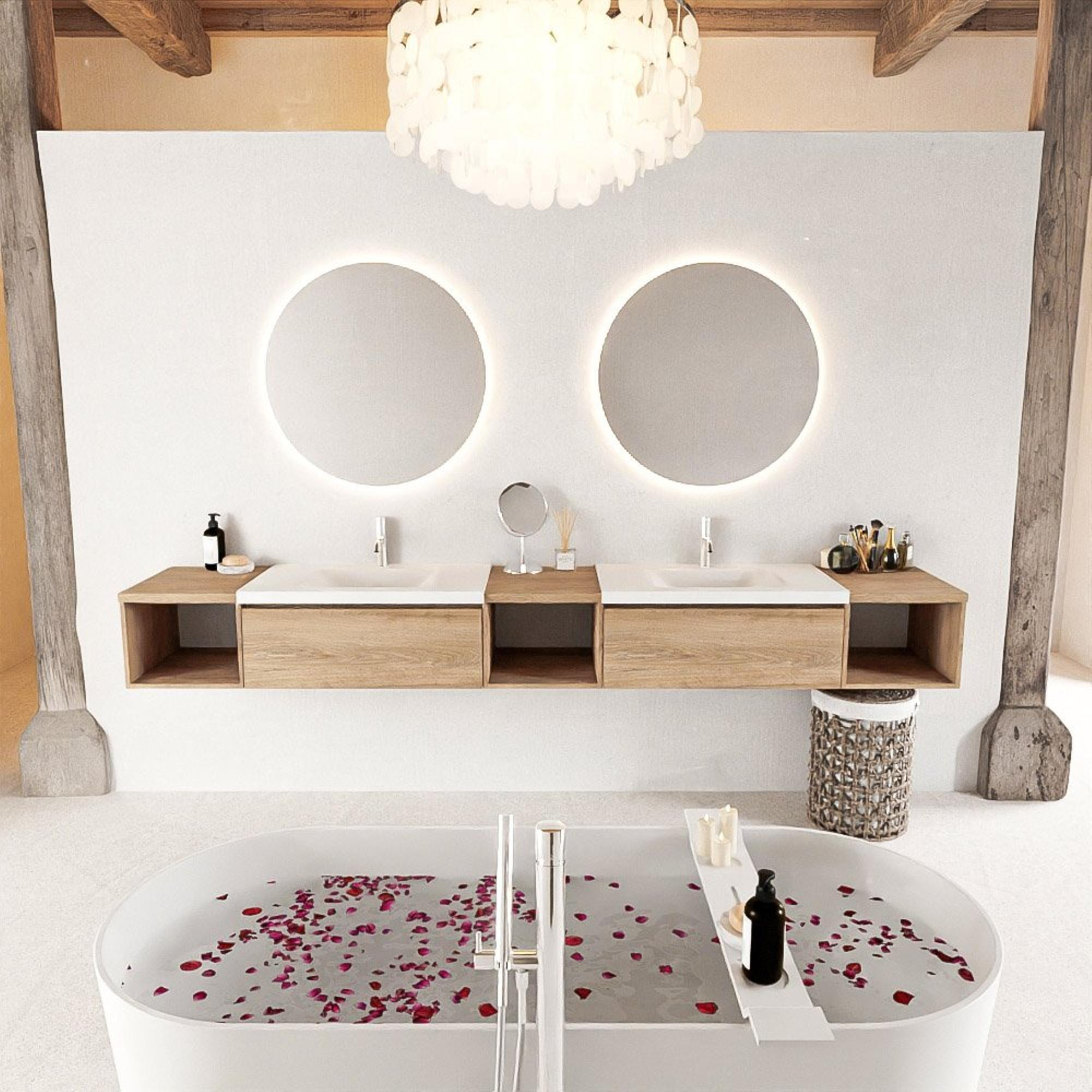 MONDIAZ BUKLA 280cm ensemble de meuble avec module ouvert 40 L+M+R couleur Chêne blanchi avec 2 tiroirs. Lavabo CLOUD double 2 trous de robinet couleur Talc.
