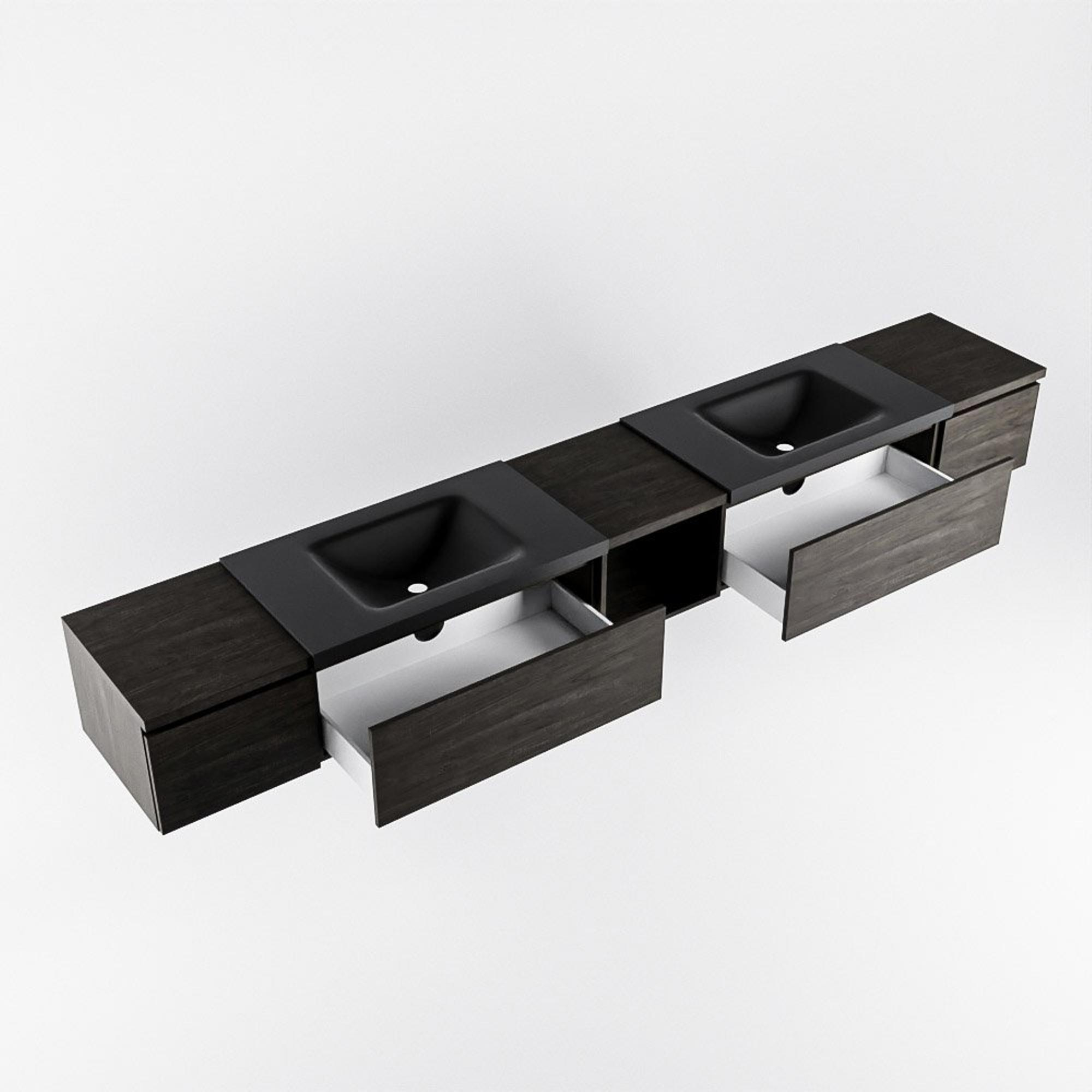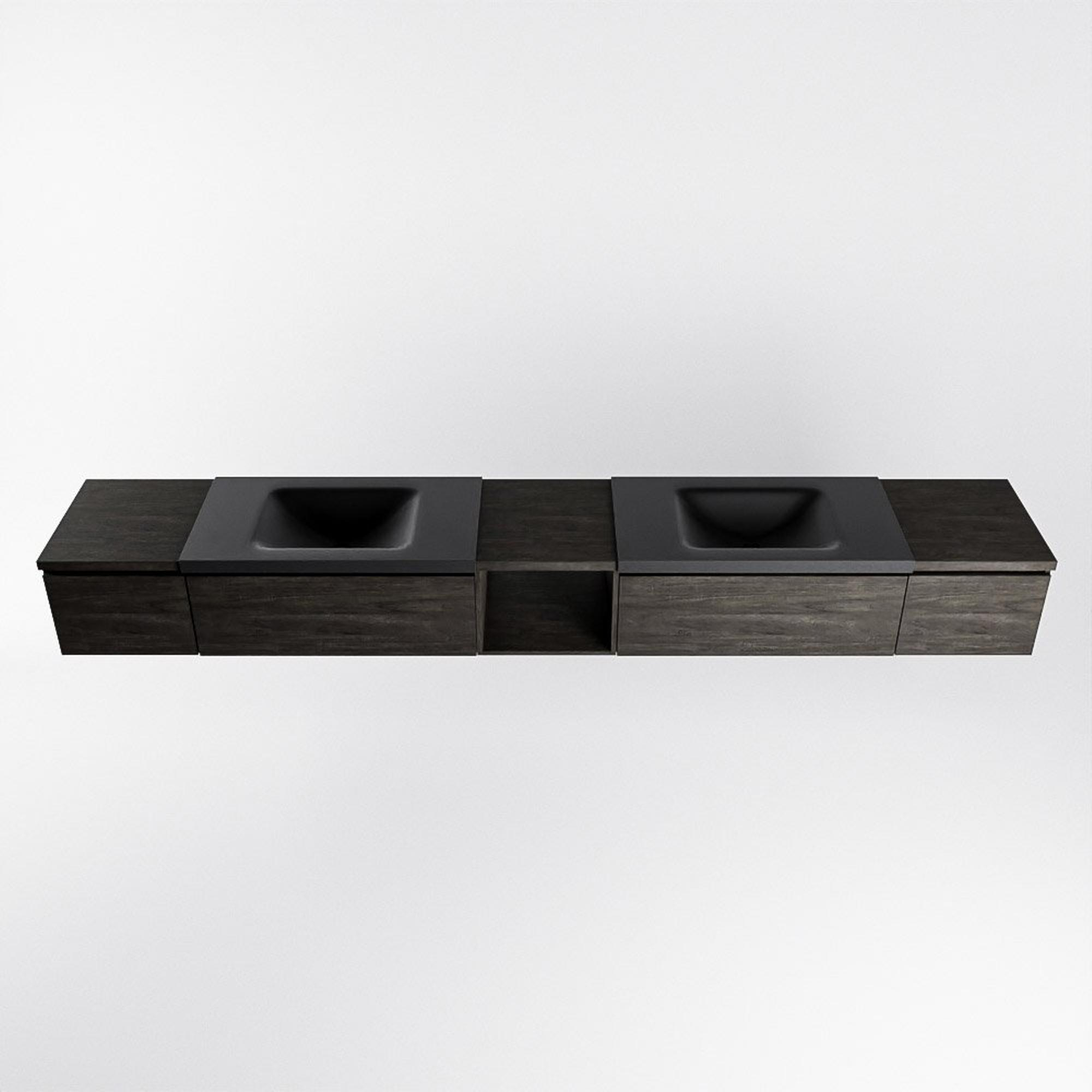 MONDIAZ BUKLA 280cm ensemble de meuble avec module ouvert 40 au milieu couleur Marron Foncé avec 4 tiroirs. Lavabo CLOUD double 0 trou de robinet couleur Urban.