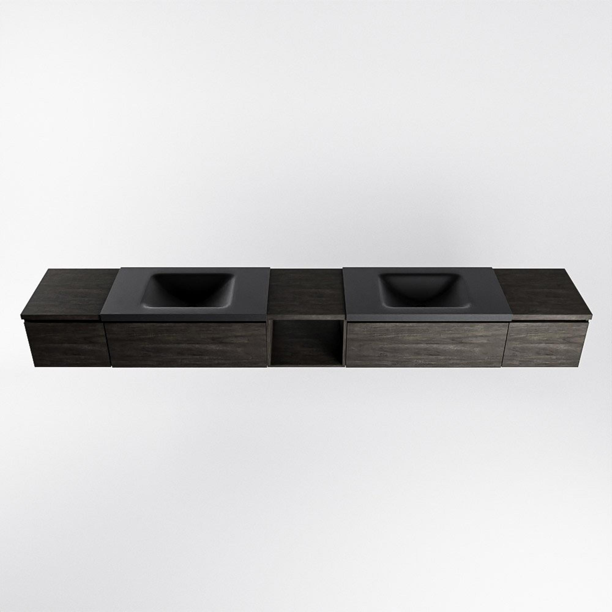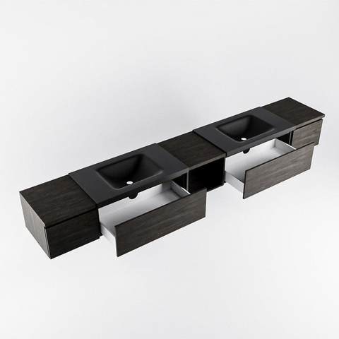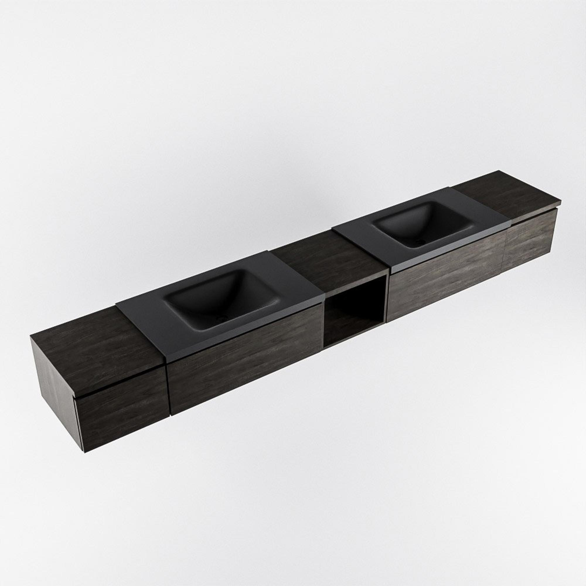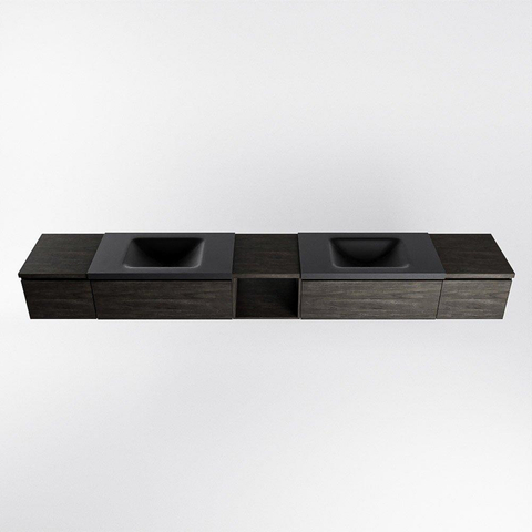 MONDIAZ BUKLA 280cm ensemble de meuble avec module ouvert 40 au milieu couleur Marron Foncé avec 4 tiroirs. Lavabo CLOUD double 2 trous de robinet couleur Urban.