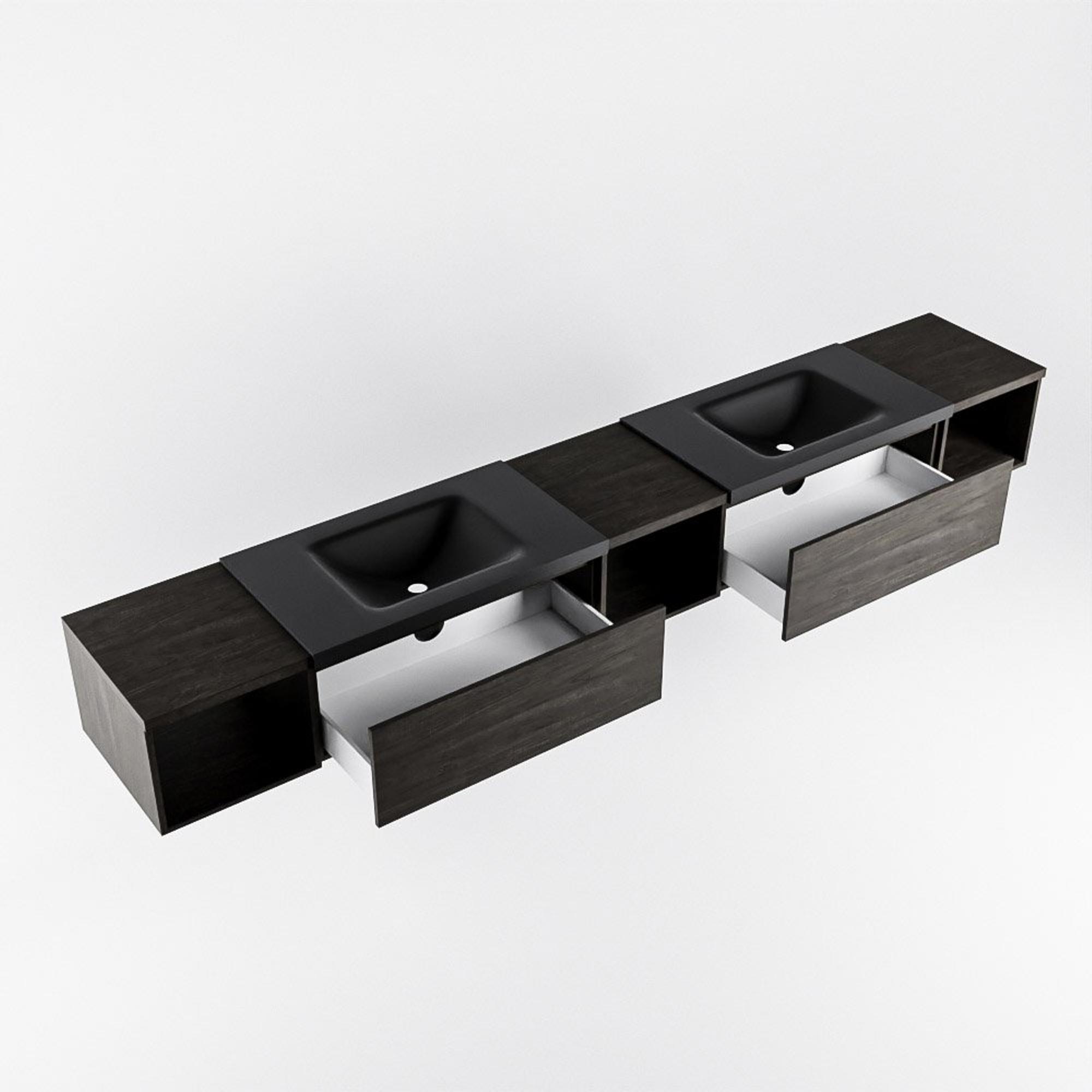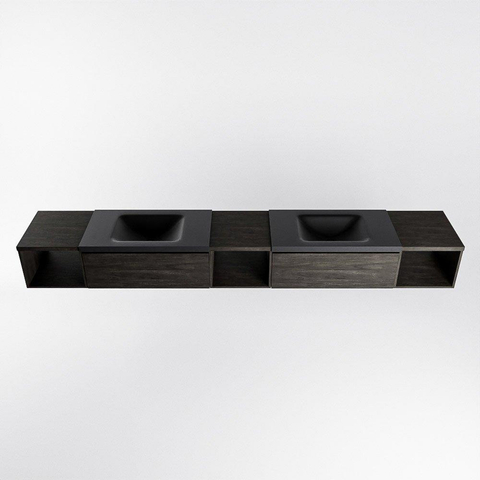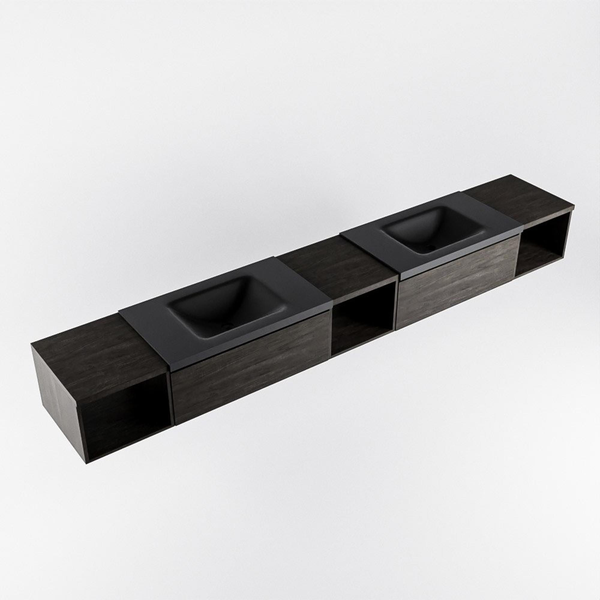 MONDIAZ BUKLA 280cm meuble de salle de bains avec module ouvert 40 L+M+R couleur Dark Brown avec 2 tiroirs. Lavabo CLOUD double 2 trous de robinet couleur Urban.